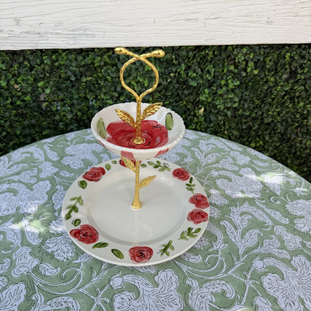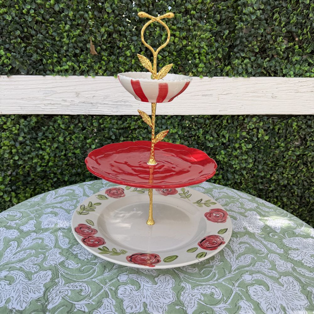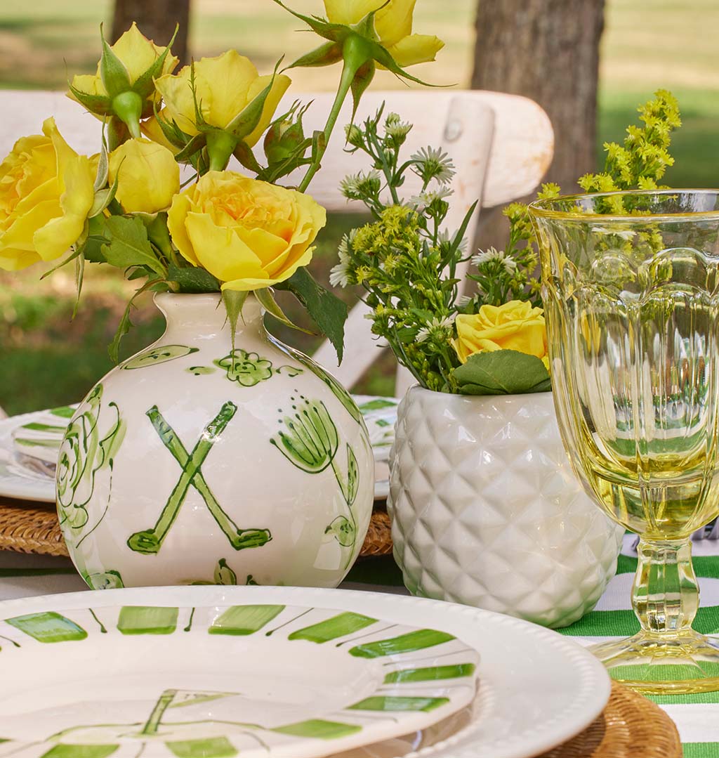 Colorful serving pieces painted with classic gingham and our signature floral pattern.