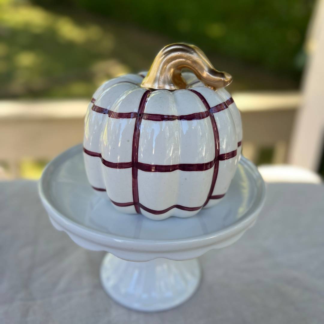 Perfect for Fall and Thanksgiving, this ceramic pumpkin painted in berry and white windowpane pattern complete with a gold top will surely be one of your favorites.