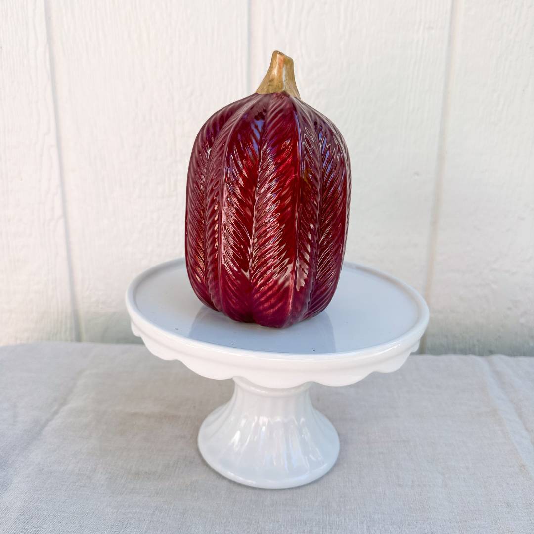 A dark berry pumpkin with a herringbone pattern, and painted with a gold top.