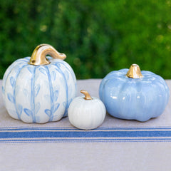 This set will include one medium squatty pumpkin in a navy gingham, one chunky pumpkin in a navy and blue floral pattern, a mini chunky in a blue chevron print, a solid blue chunky mini and a mini pie pumpkin in white. Each pumpkin is adorned with a gold stem.