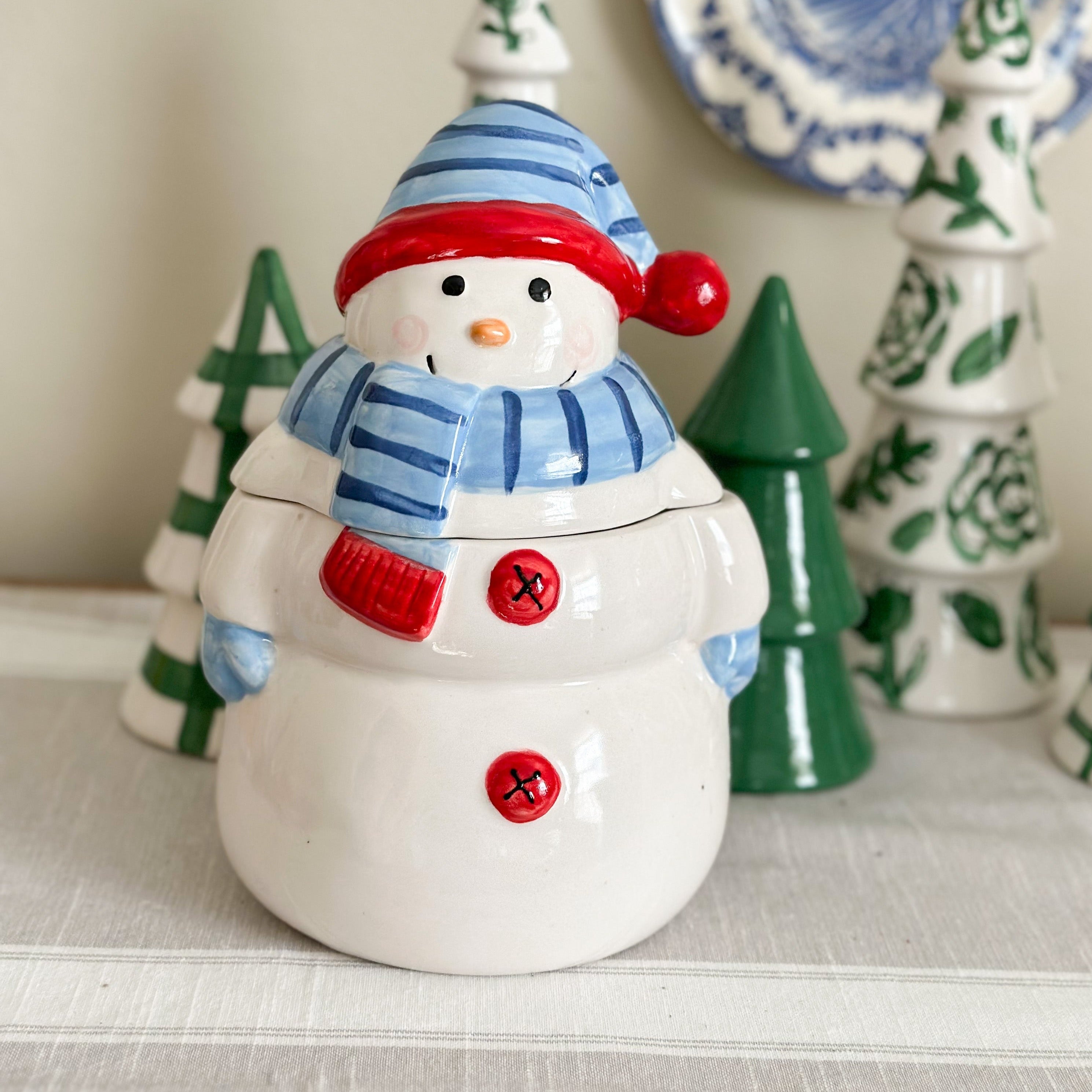 The perfect addition to your holiday kitchen. With its hand painted details and matching hat and scarf, it is perfect to store all of your holiday treats!