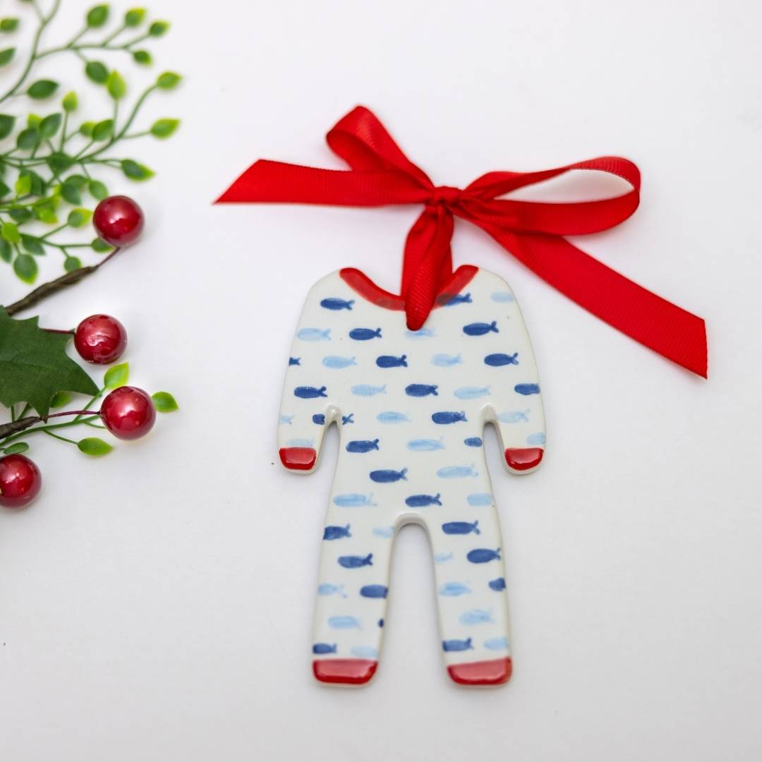 Hand painted, personalized, ceramic ornament with a fish pattern on pajamas. So cute you will want one for every member of your family!