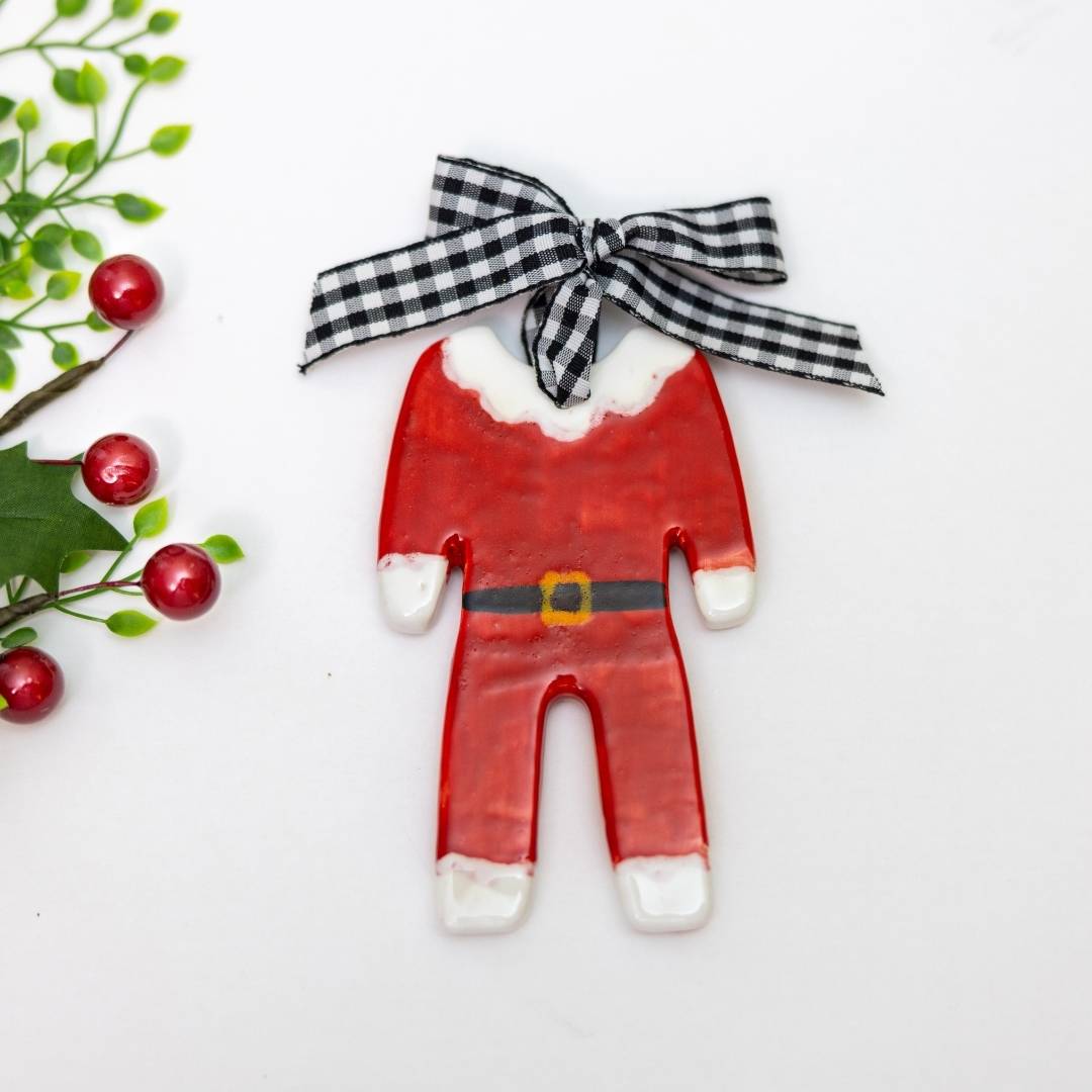 Hand painted, personalized, ceramic red Santa pajama ornament. So cute you will want one for every member of your family!