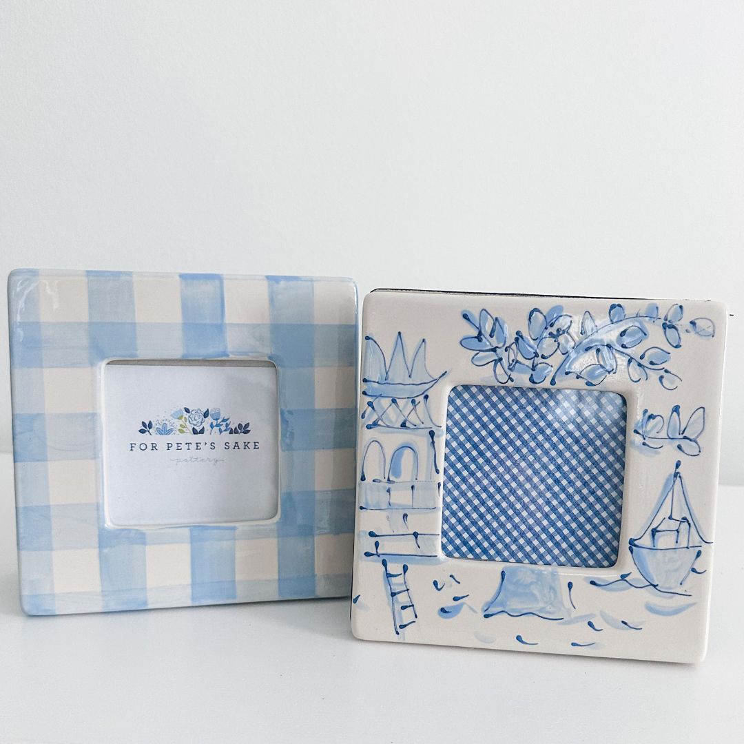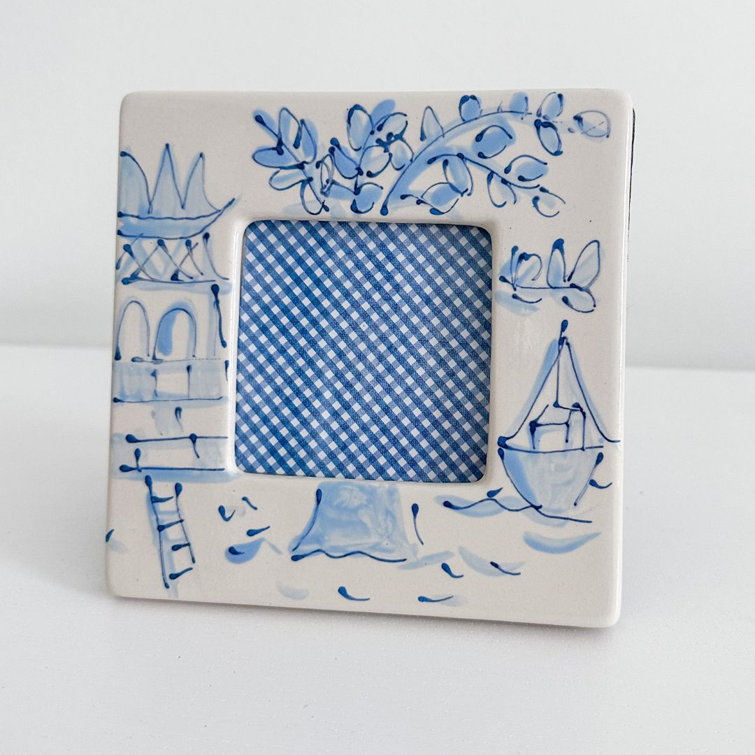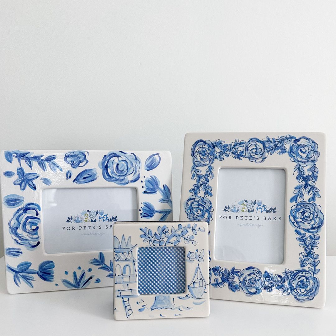 A beautiful frame can add so much to your room. Like the perfect necklace or accessory to accent your outfit, this design will be that extra something for your decor. Hand painted in my special pattern, this a nice, heavyweight, ceramic frame that comes with glass and is ready to display.