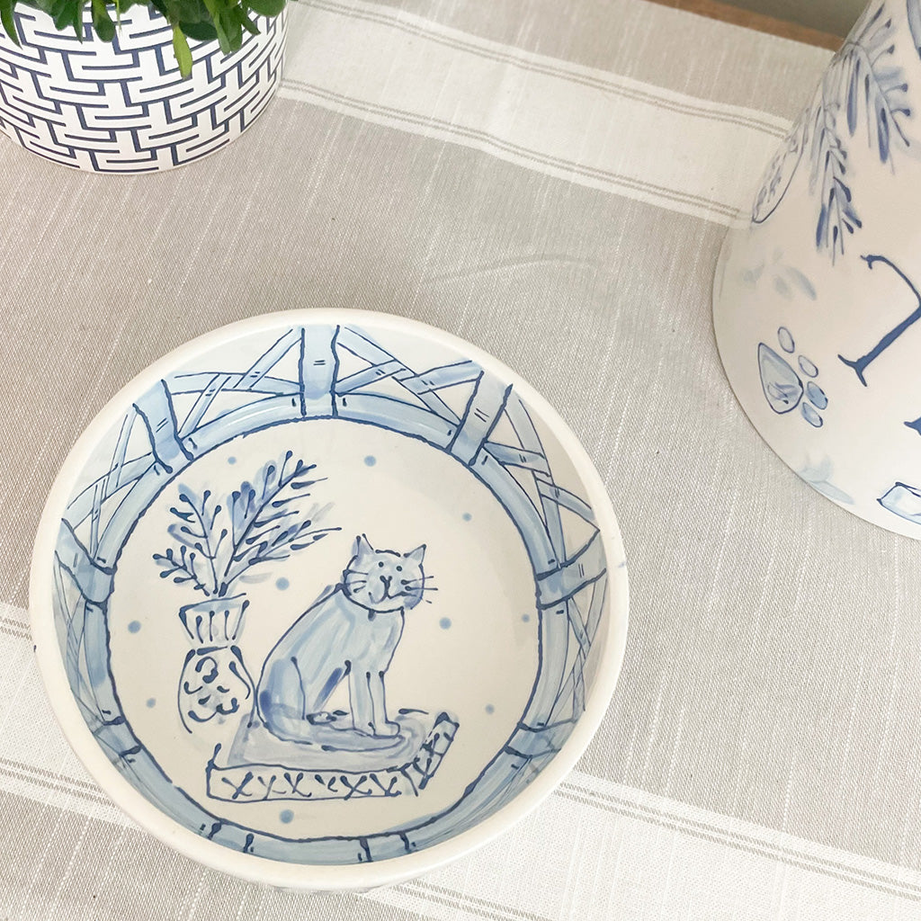 Just like our chinoiserie dog bowl, but in a small size perfect for cats! This beautiful cat bowl with a chinoiserie pattern can be personalized with your cat's name on the outside.