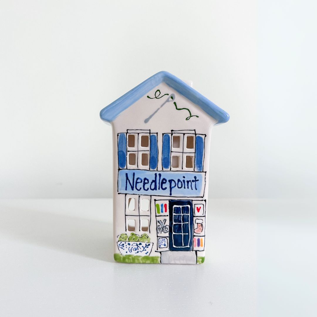 Brighten up your space with the Needlepoint Short House Village Lantern, a charming piece inspired by needlepoint lovers. Painted in cheerful blue and white, this whimsical village house brings a playful and cozy vibe to any room. Whether displayed on a shelf or as part of an arrangement with our our village homes, this lantern lights up your home with warmth and charm.