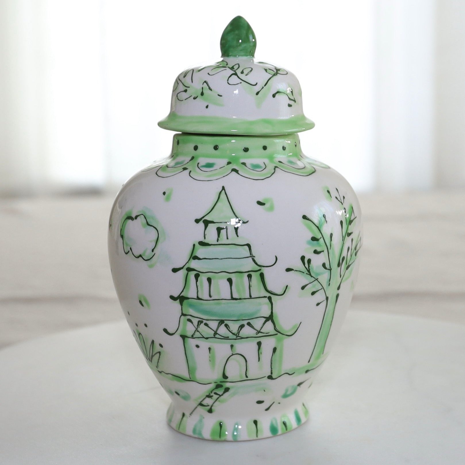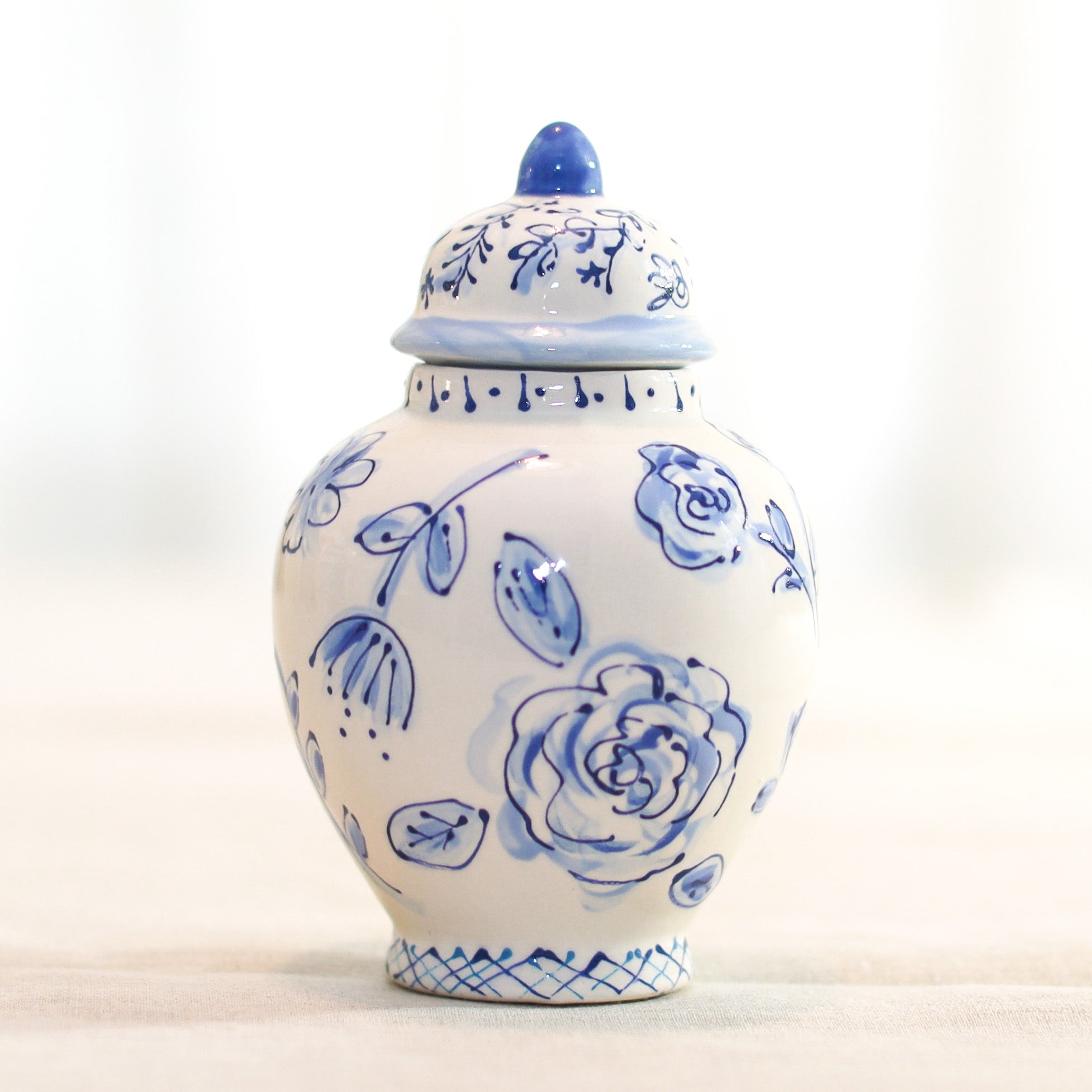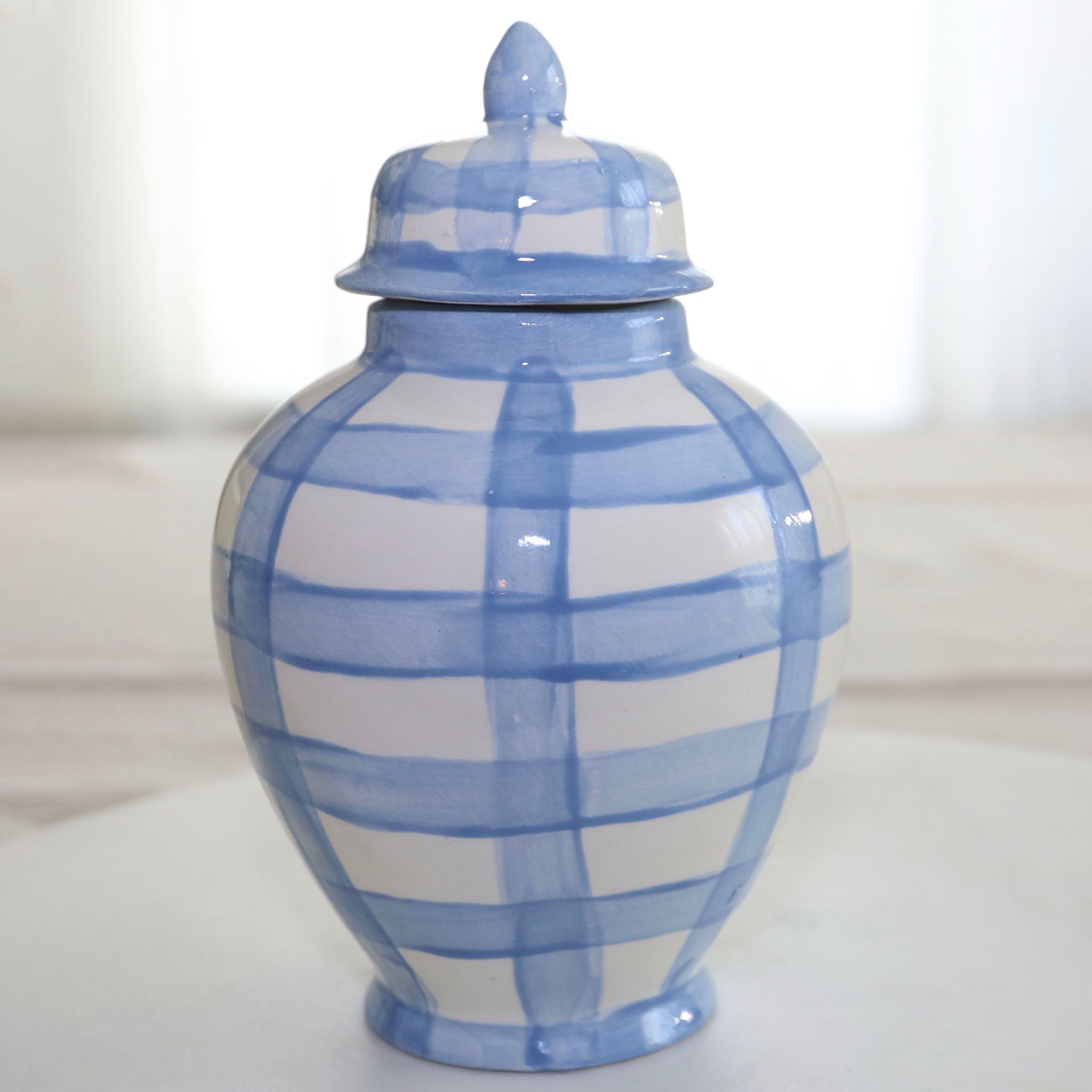 This Sophie ginger jar features a hand-painted design, with modern floral, chinoiserie, or gingham patterns to choose from. It's the perfect addition to your kitchen or bookshelf decor!