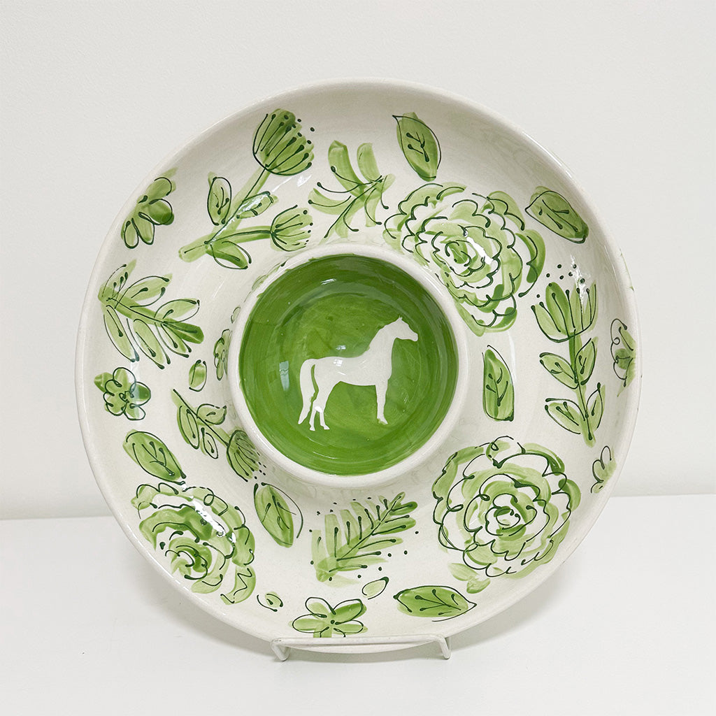 This modern floral server is hand painted with my signature modern floral pattern and a horse in the center. A perfect dish to serve chips and dip or veggies and dressing at your Derby party this year!