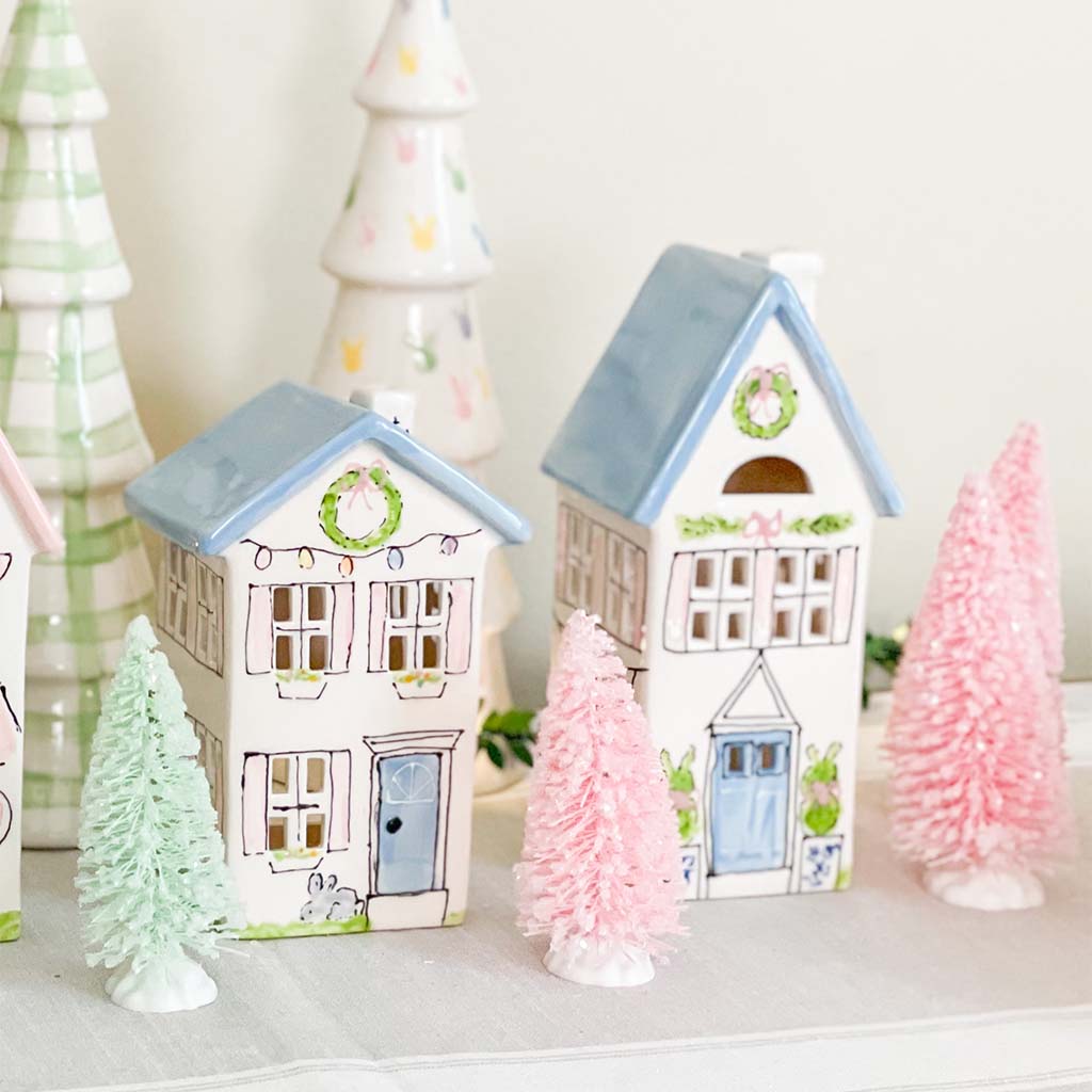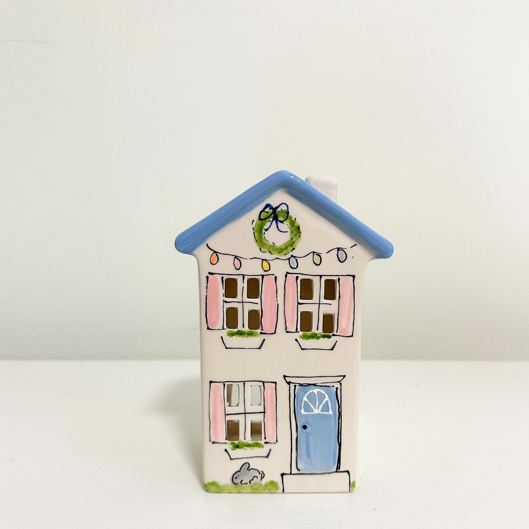 This Easter themed village lantern features a blue roof, an egg banner and a bunny in the front yard. It makes a perfect addition to your Easter decor. Mix and match this with our other holiday home lanterns and create your own holiday village!