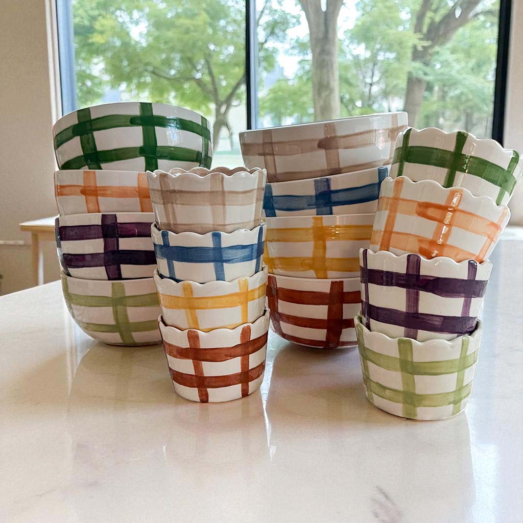 These scalloped gingham bowls are perfect for sprucing up your everyday dishes! They come in 8 vibrant colors and feature a scalloped top plus gingham on the outside and a solid color on the inside. Coordinate with our Mary Alice bowls for a cheerful setup or pair them with our large floral platter for a great presentation!