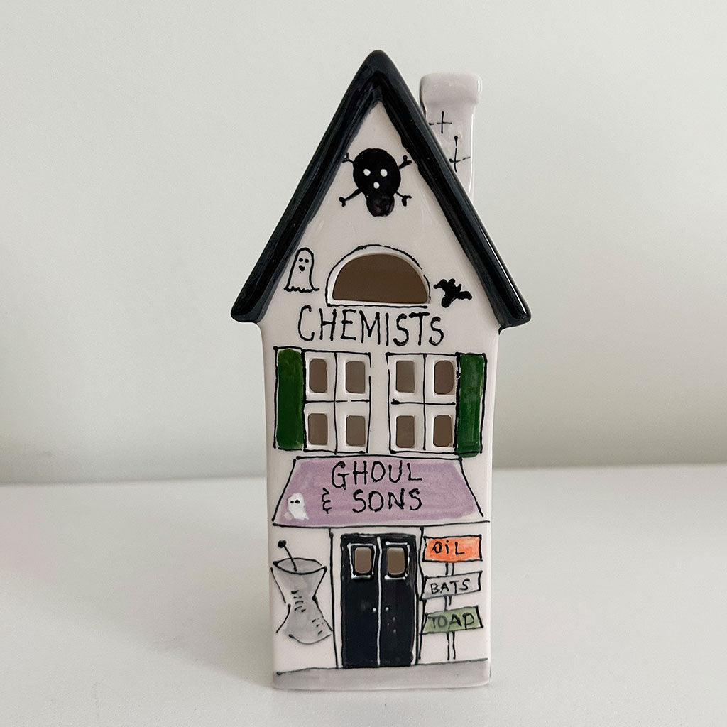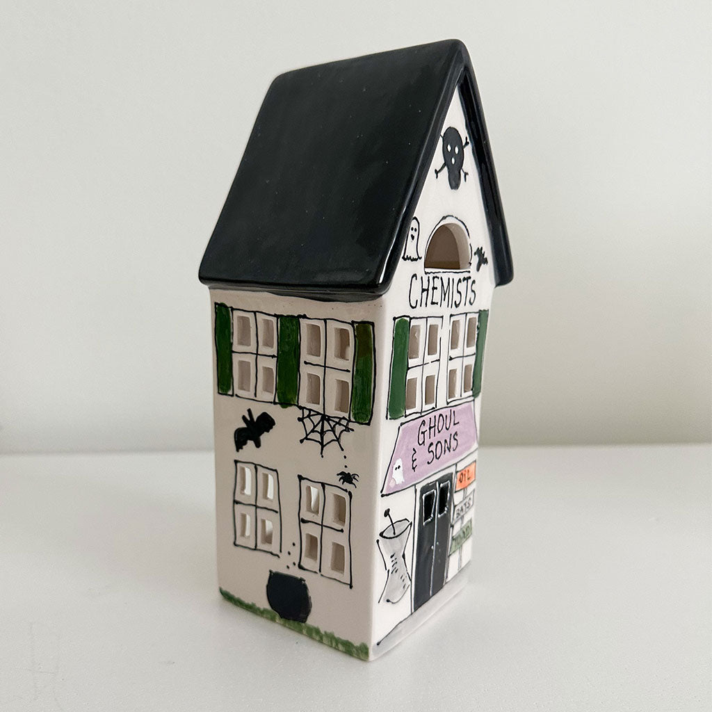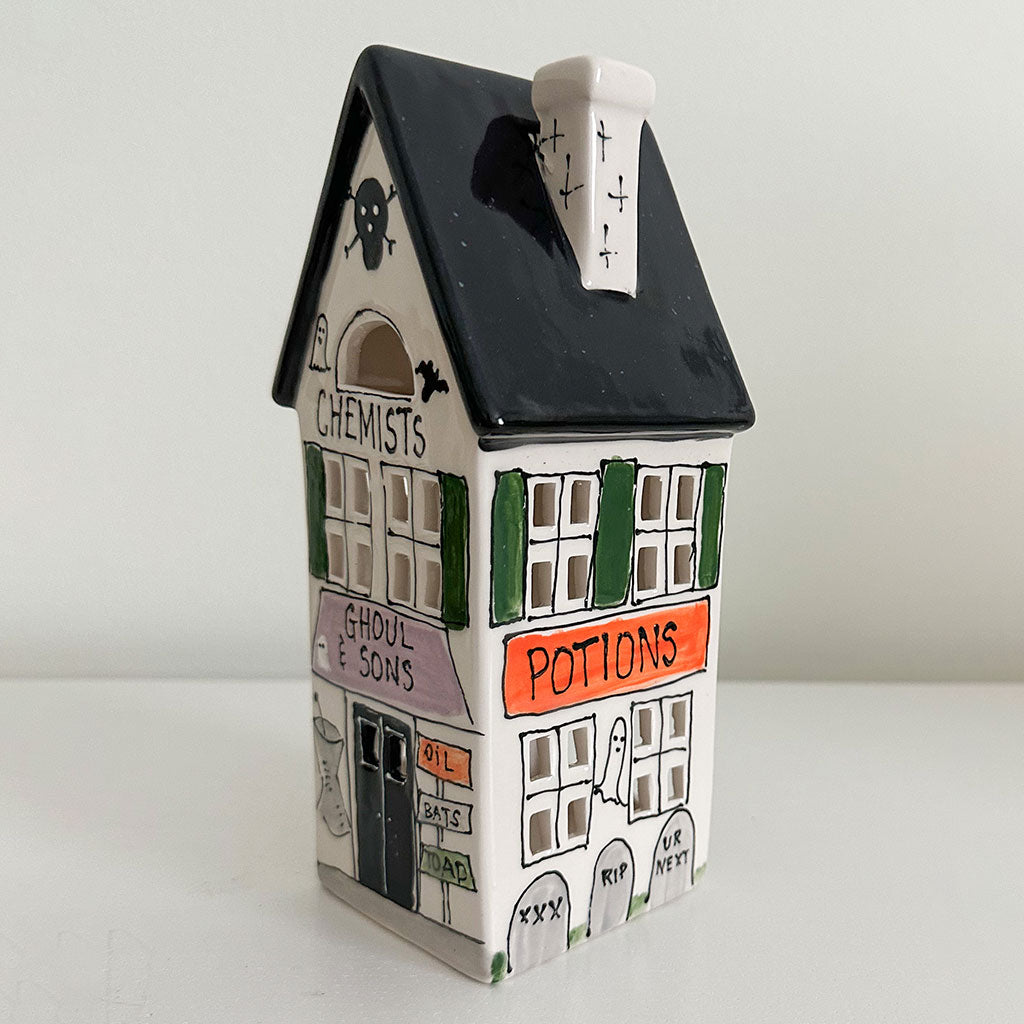 New for 2023! This Chemists Ghoul & Sons Halloween themed village lantern features a black roof and is decorated for halloween festivities! It makes a perfect addition to your Halloween decor. Mix and match this with our other holiday home lanterns and create your own holiday village!