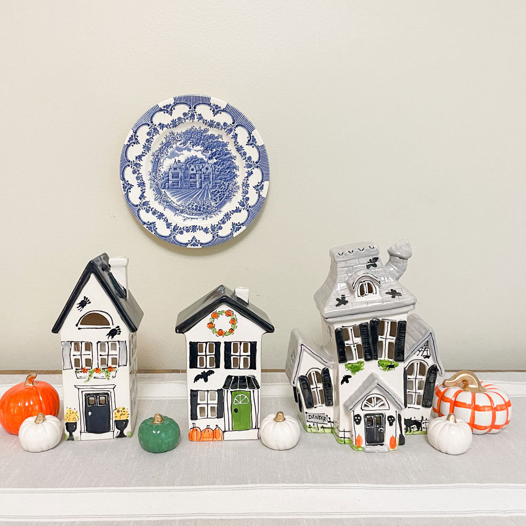 This Fall themed village lantern features a black roof and is decorated for fall and halloween festivities! It makes a perfect addition to your fall decor. Mix and match this with our other holiday home lanterns and create your own holiday village!