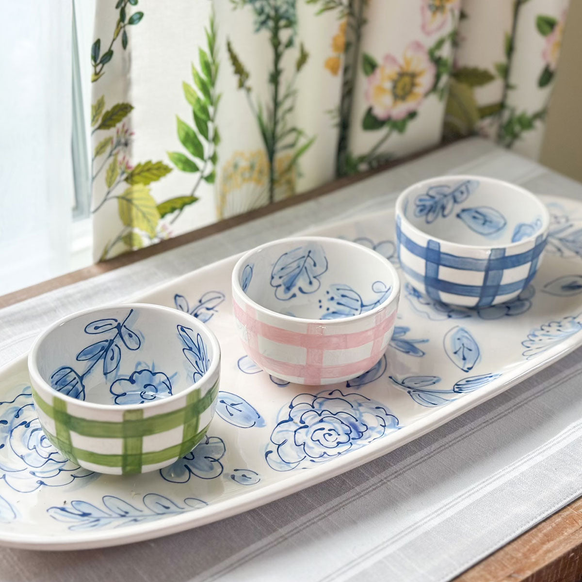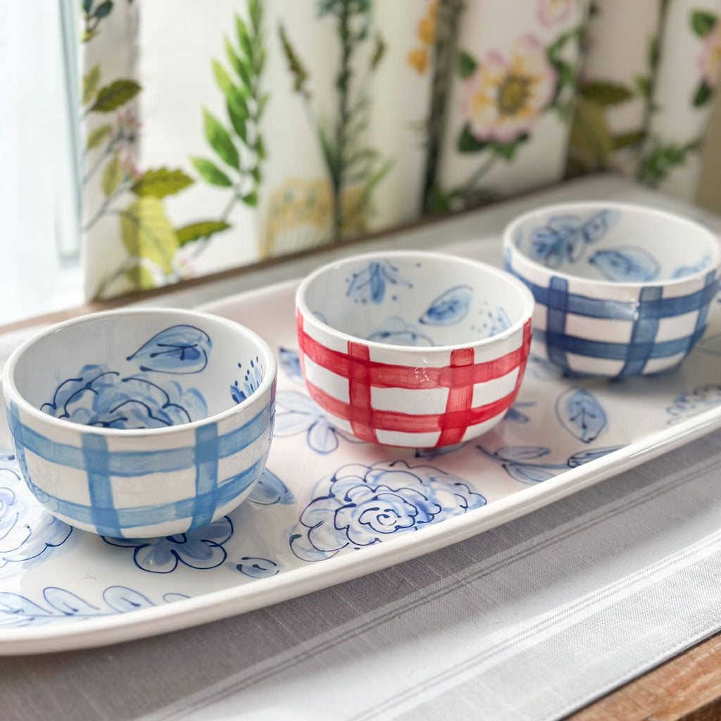 Hand painted with a gingham pattern on the outside and our signature floral pattern on the inside, and available in 7 colorways, this bowl will be one of your favorites. Pair them with our large oval serving platter to make a charcuterie board, or use them for side dishes. Mix and match the colors and sizes to make a great tablescape!