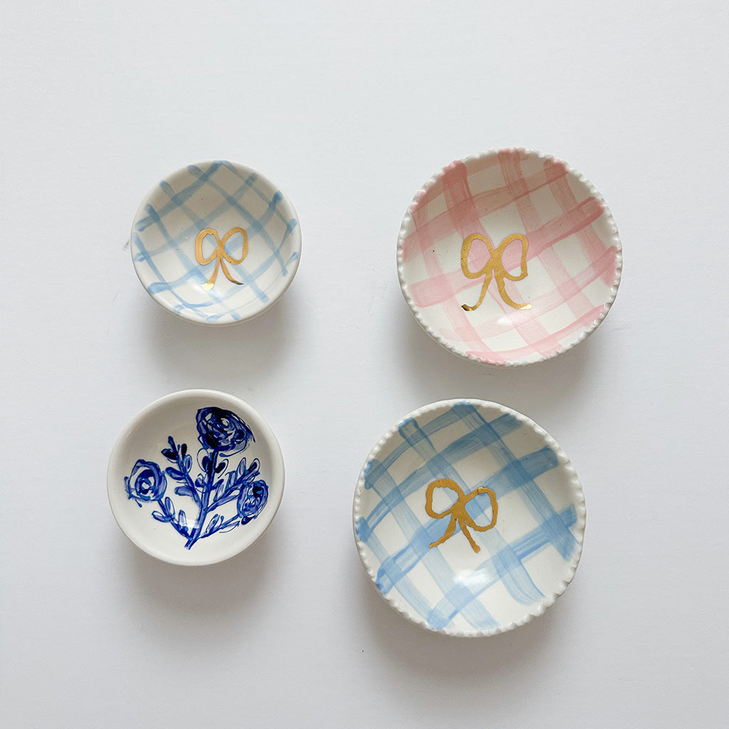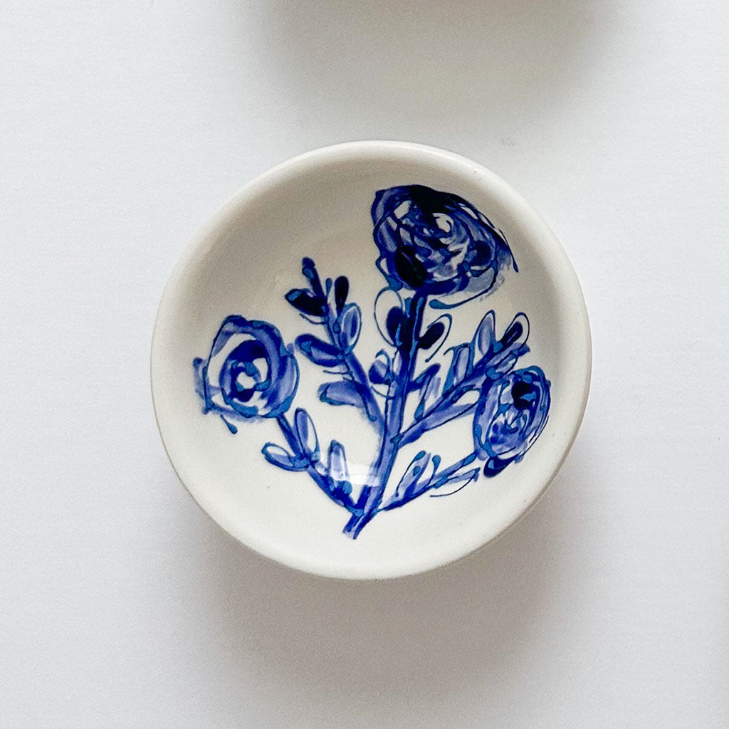 This elegant dish showcases a hand-painted design of delicate navy flowers, perfect for elevating your nightstand decor or as a thoughtful gift for a loved one.