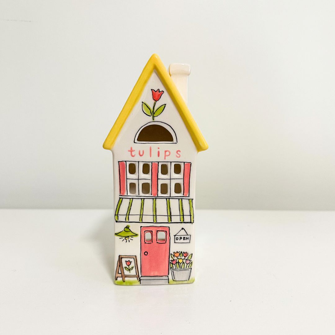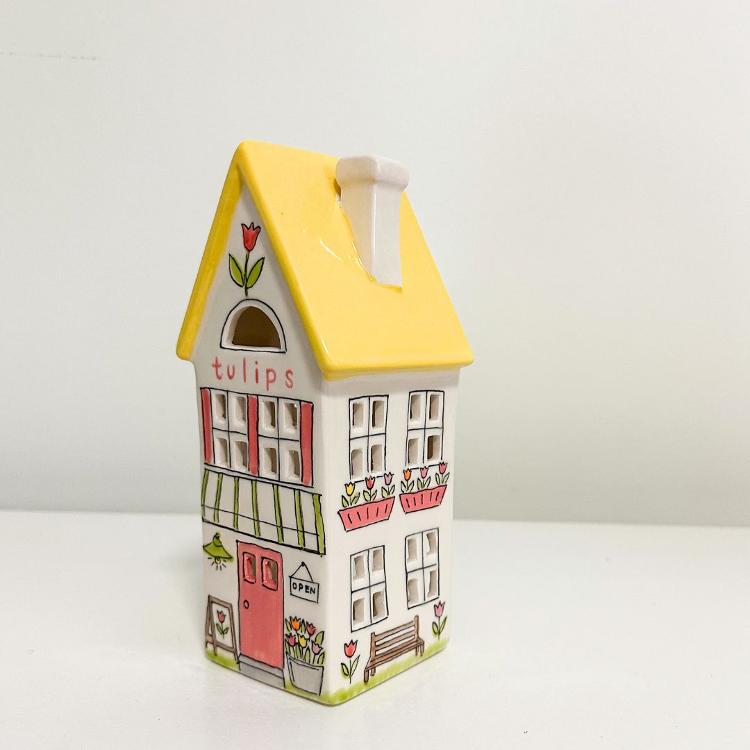 This cheery tulip themed village lantern features a yellow roof and tulips painted around the house. It makes a perfect addition to your Village home lantern collection!