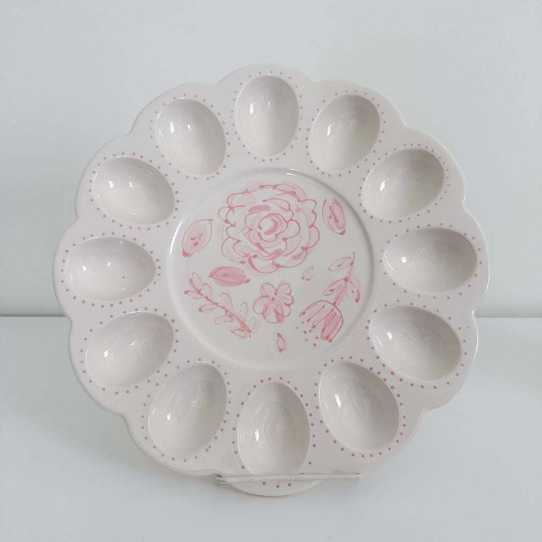 Celebrate spring with this beautiful, hand painted, ceramic deviled egg platter. An instant classic for a beautiful tablescape. A simple, classic design in the center and accented with small dots around each egg tray. This beautiful platter and classic colors make this piece perfect for all year round serving.