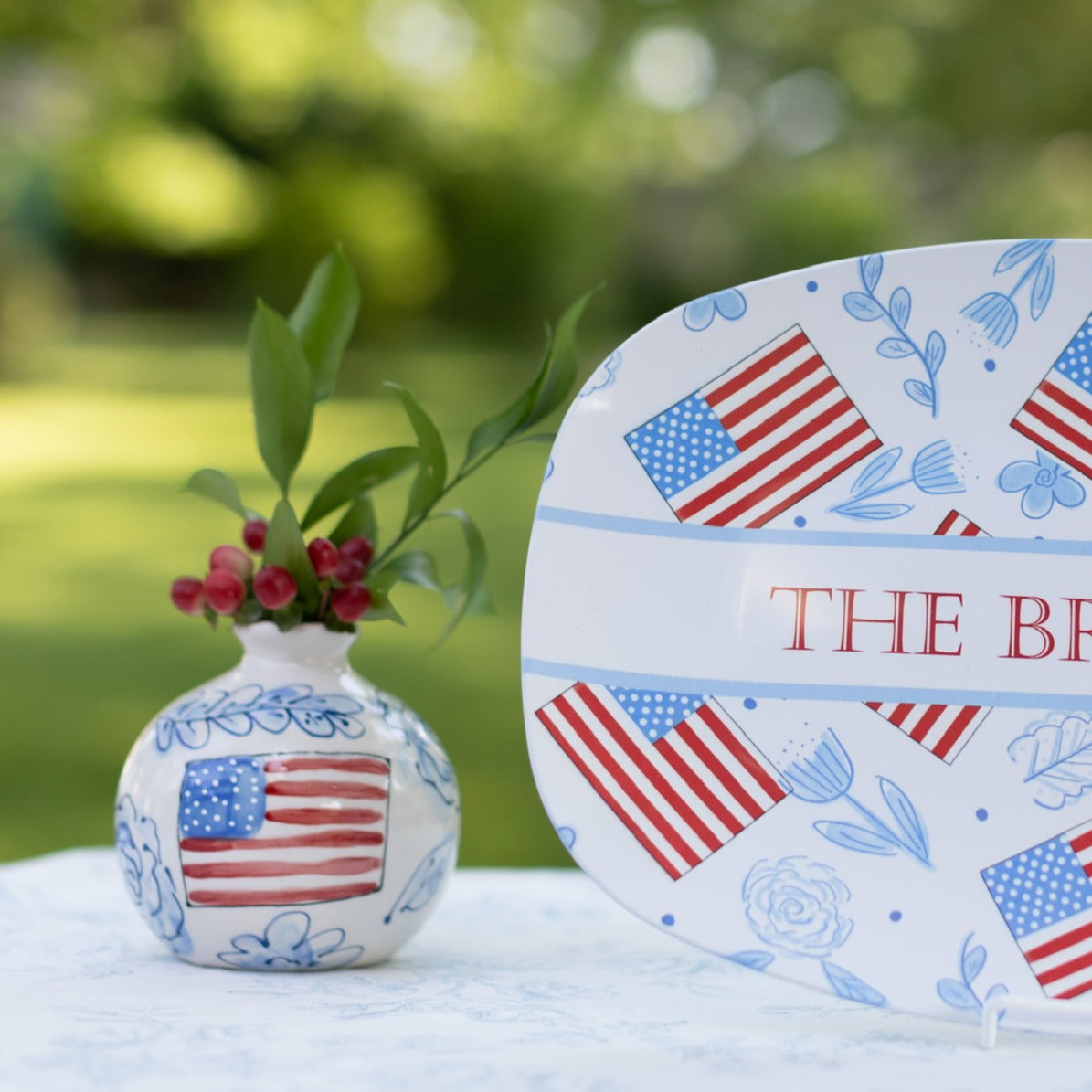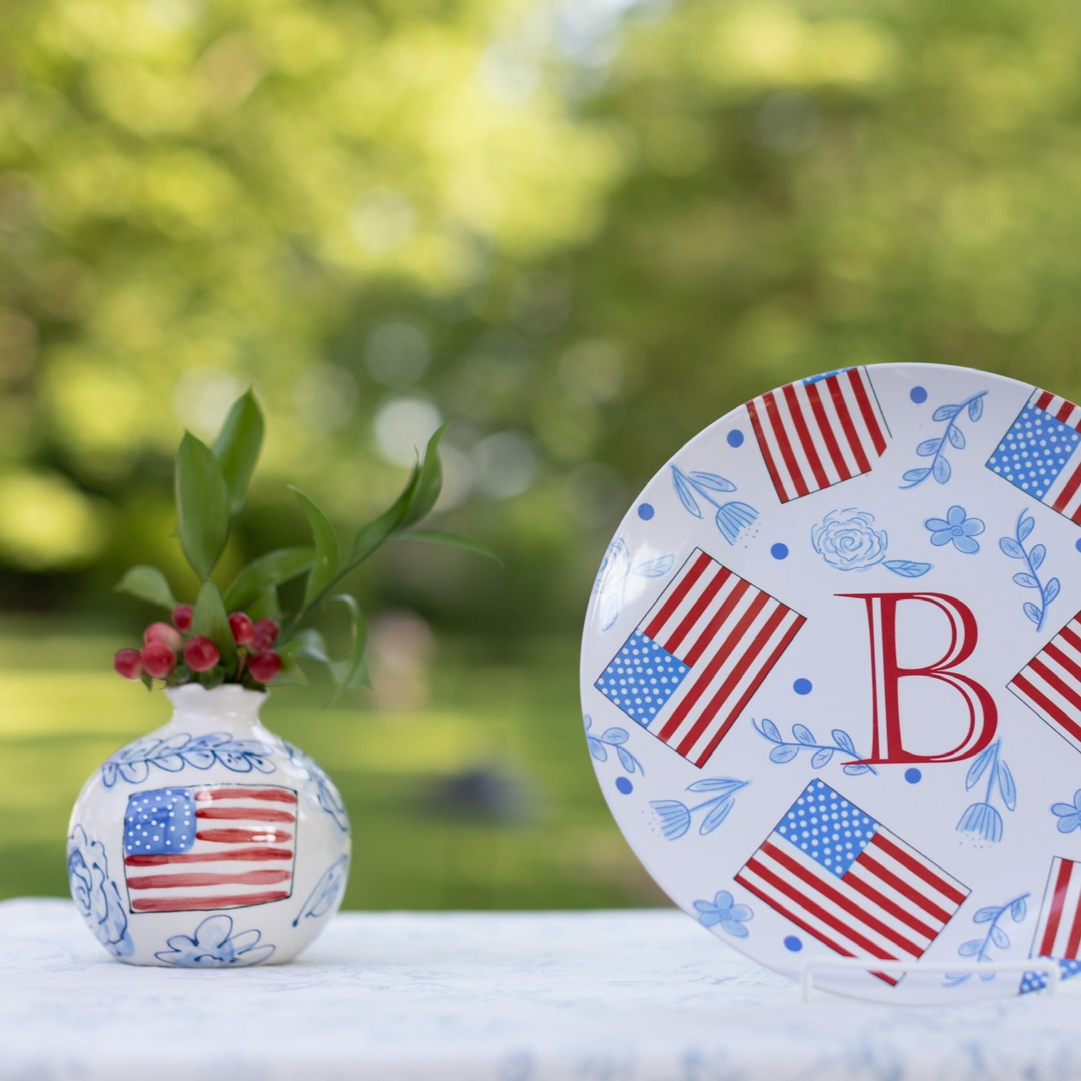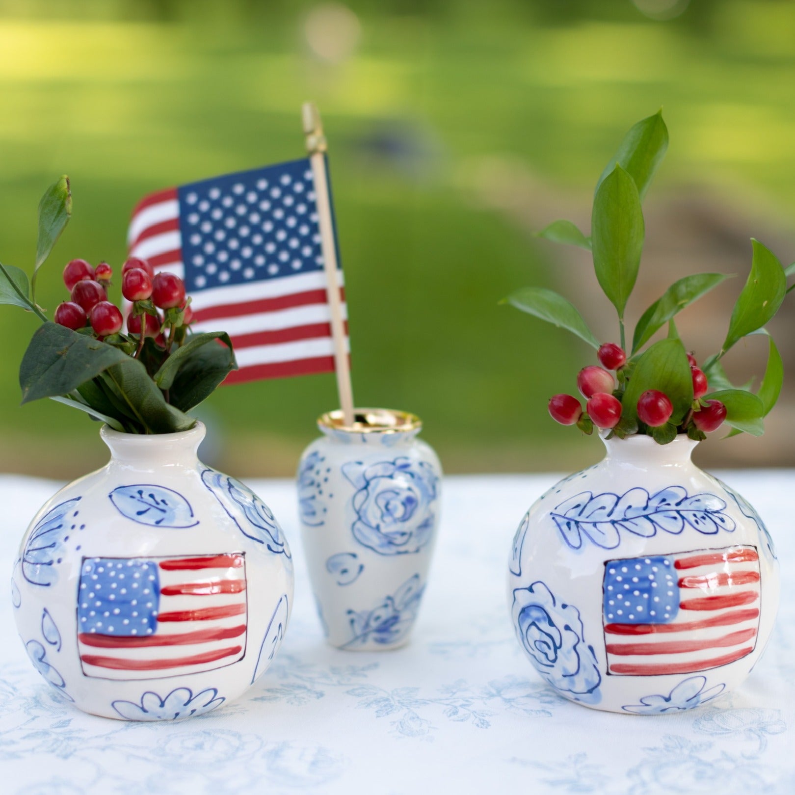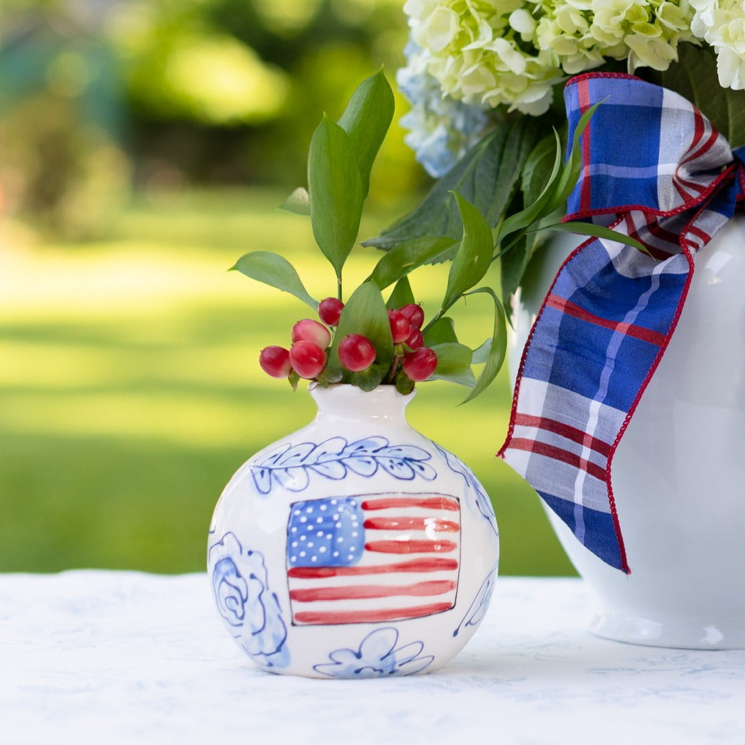 This ball vase is lovingly handpainted in my floral pattern and includes an American flag painted on one side. Display the side with the flag for 4th of July, Election Day, Memorial Day, or any holiday and then reverse it for the rest of the year.