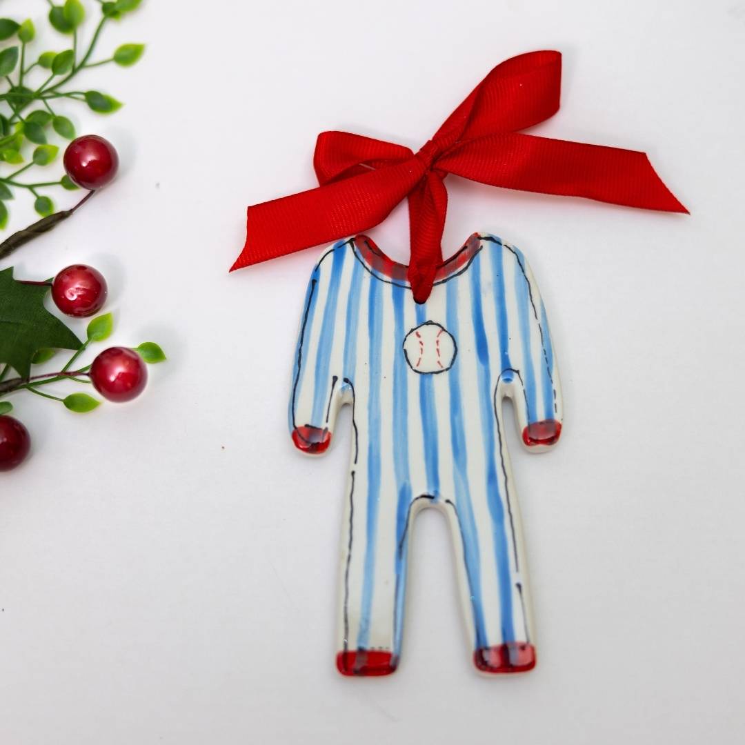 Hand painted, personalized, ceramic ornament with a striped baseball pajama pattern. So cute you will want one for every member of your family!
