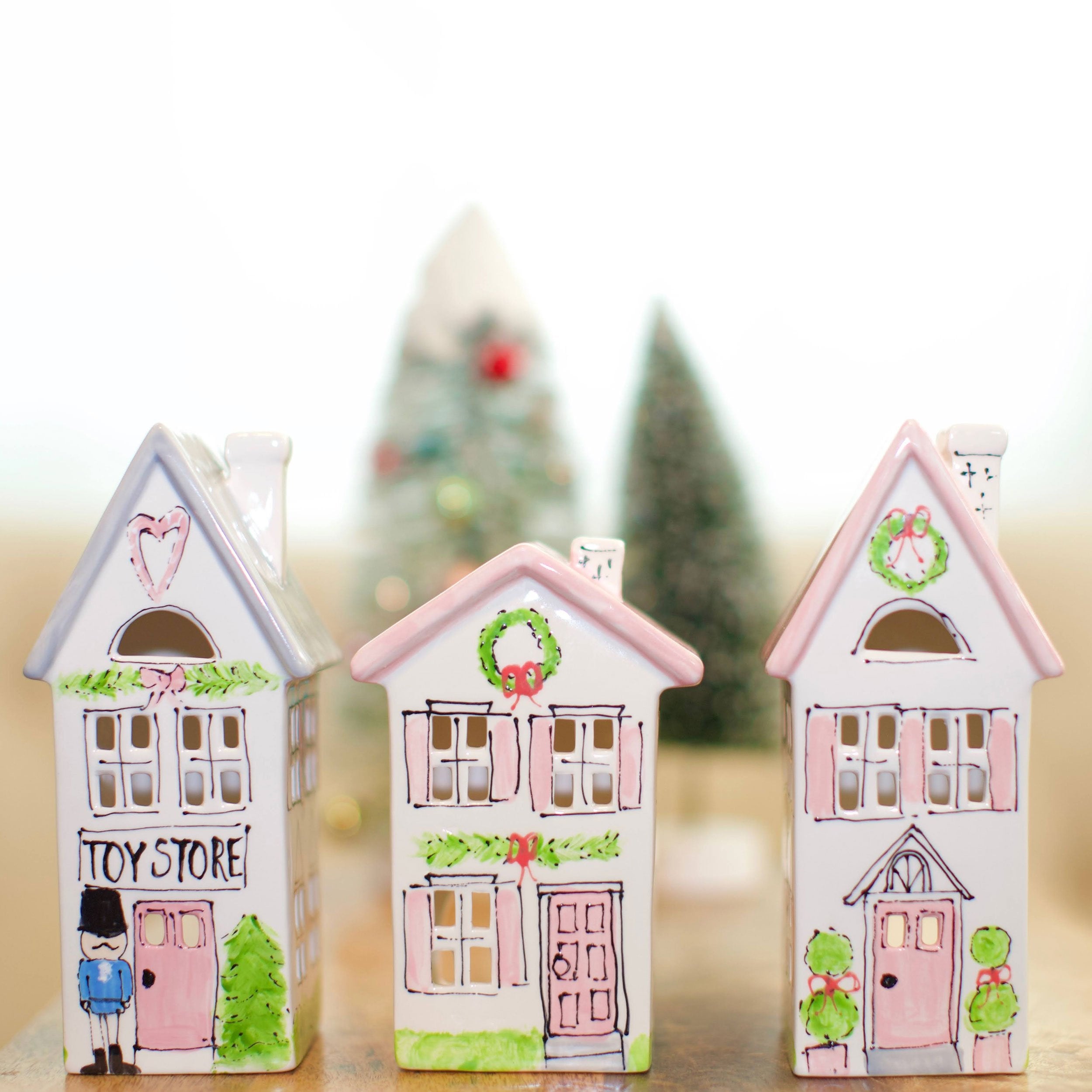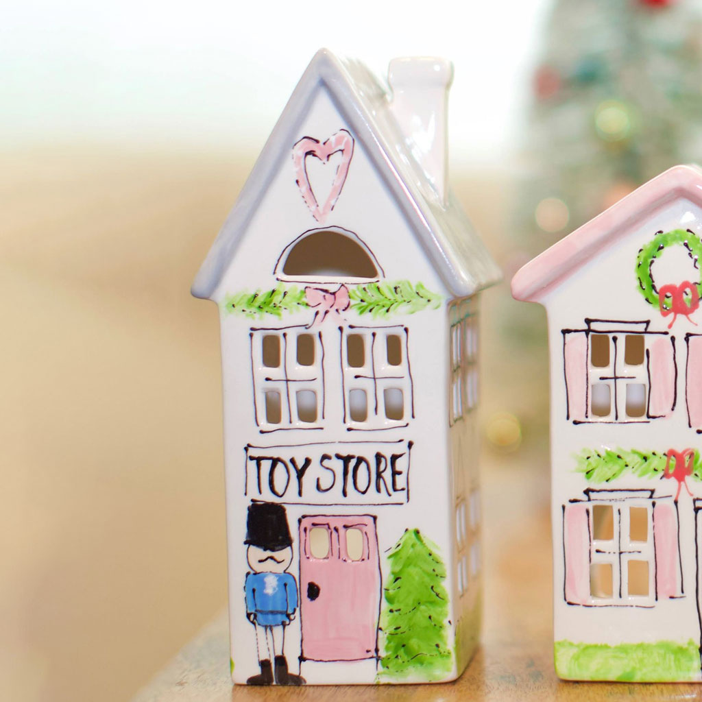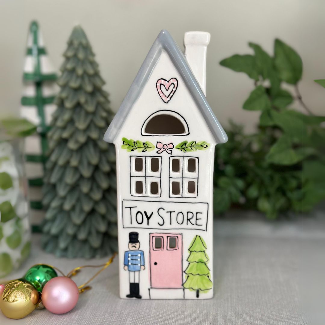 Add this adorable toy store to our Christmas house and church to make your own Christmas village! Hand painted in a classic style, this will be a keepsake for many years to come. Drop in a tea light and watch them glow from the inside.