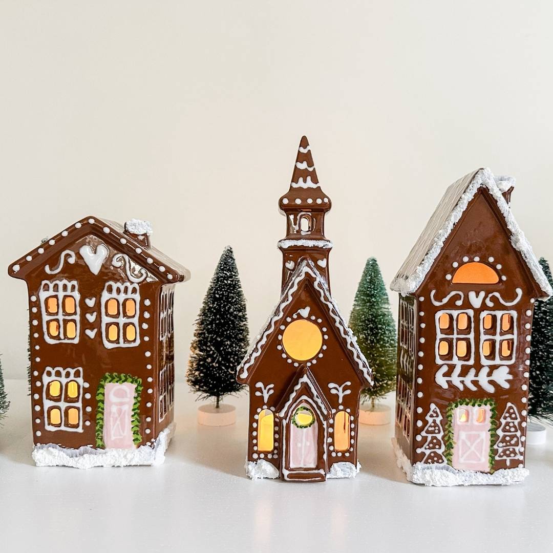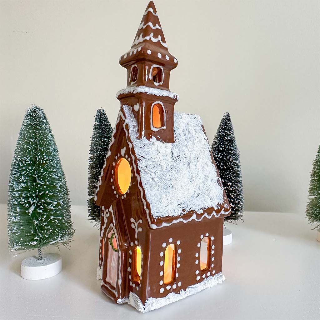 This charming church lantern is hand painted in a delightful gingerbread house style. It's sure to become a treasured keepsake for years to come. Simply add a tea light and enjoy the cozy glow from within.
