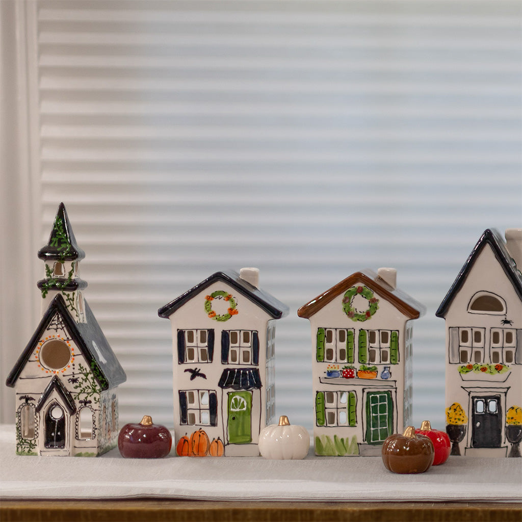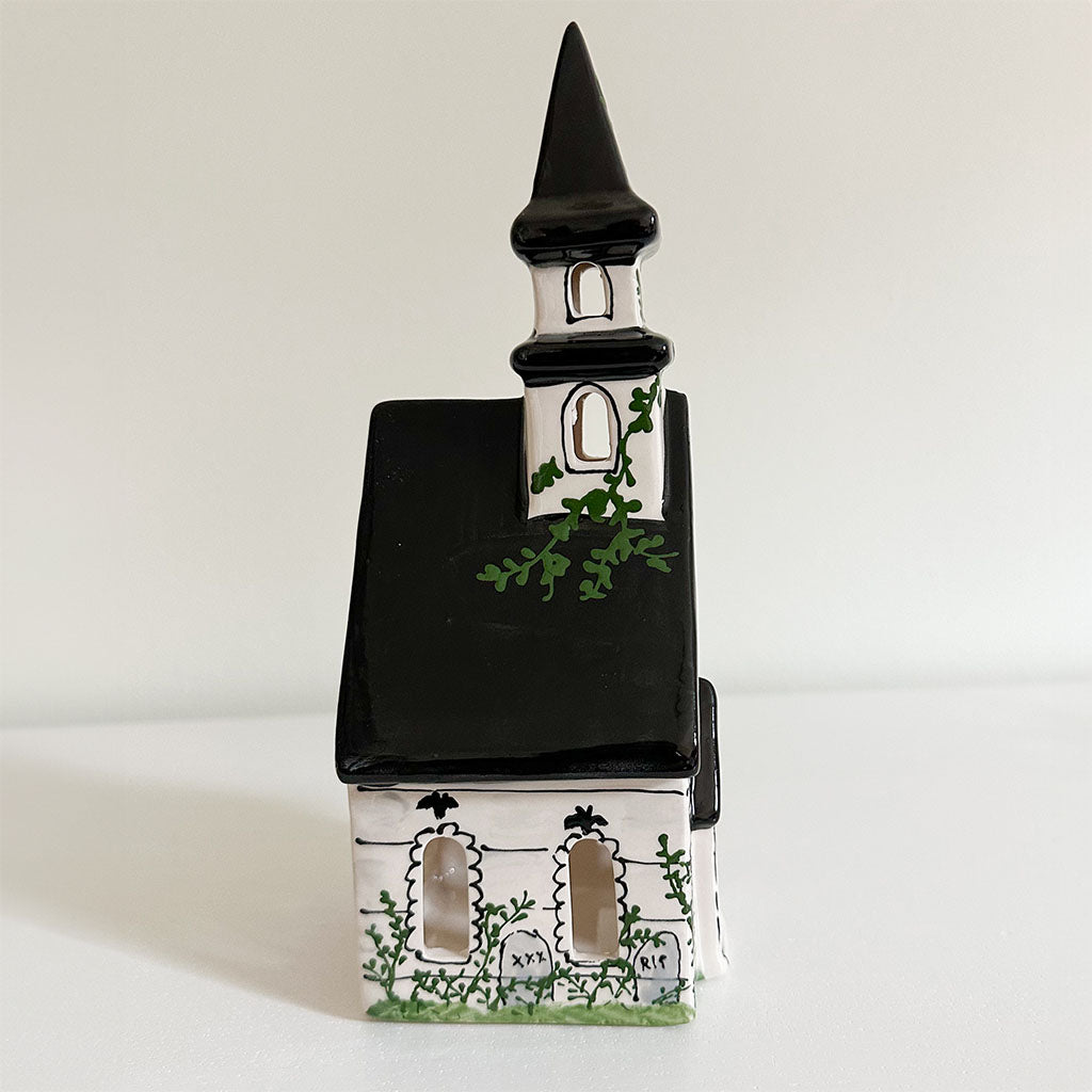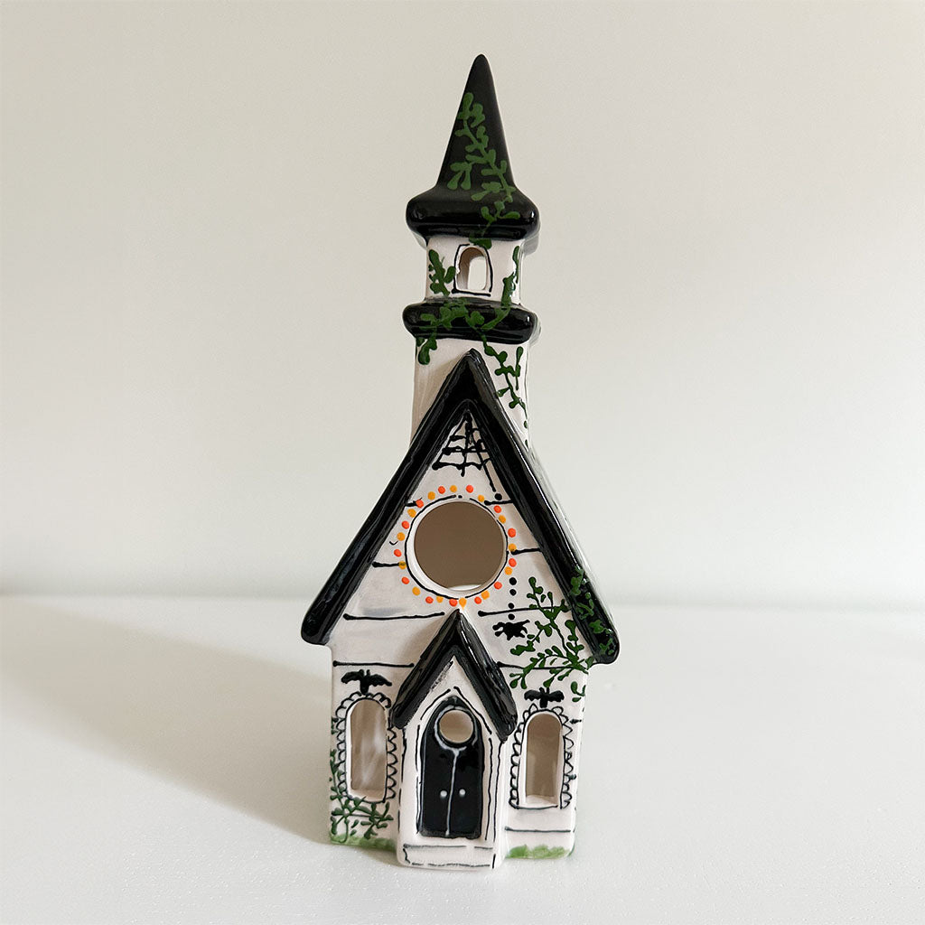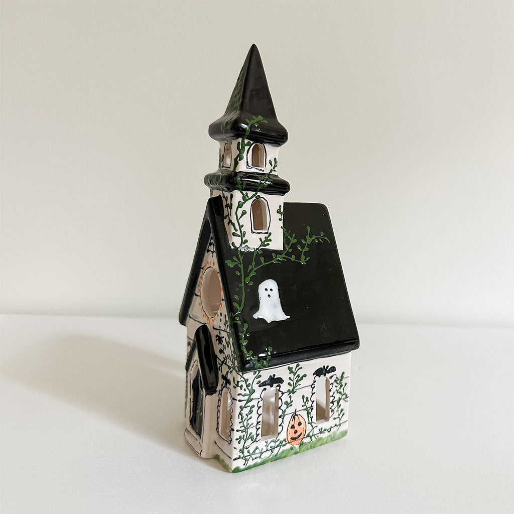 Hand painted in spooky style, this village church lantern is perfect to decorate for Halloween! Drop in a tea light and watch it glow from the inside.
