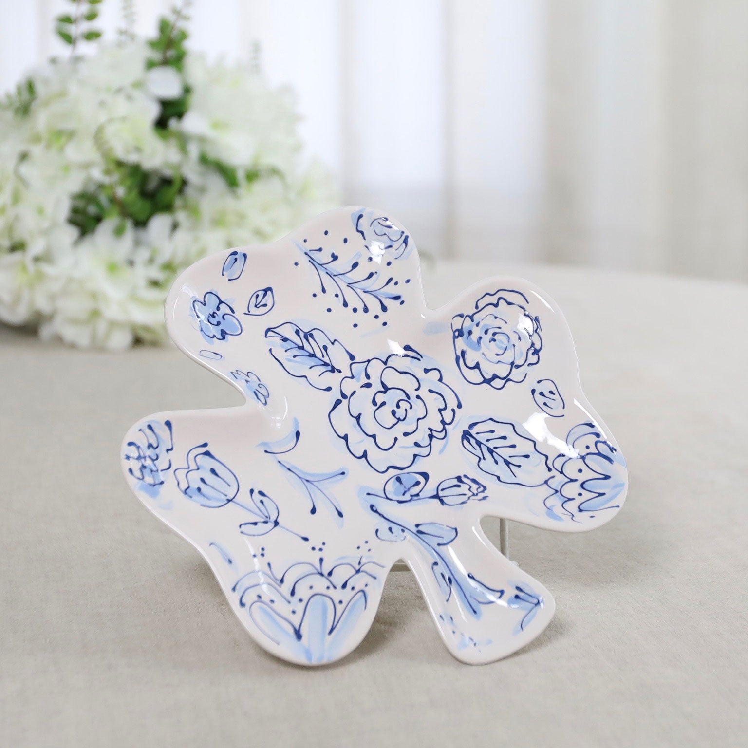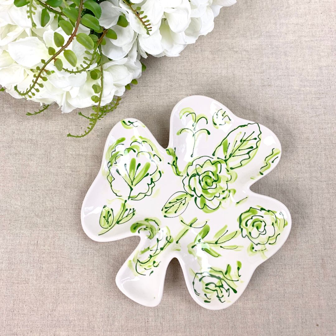 Get ready to celebrate St. Patrick's Day in style with this gorgeous shamrock clover shaped dish. This dish will not only add a touch of charm to your home decor, but it's also versatile enough to be used as a candy, soap, or jewelry dish. Delicately hand-painted, glazed, and fired, this dish features a lovely green and white floral pattern. Welcome the month of March with this must-have dish for your kitchen.