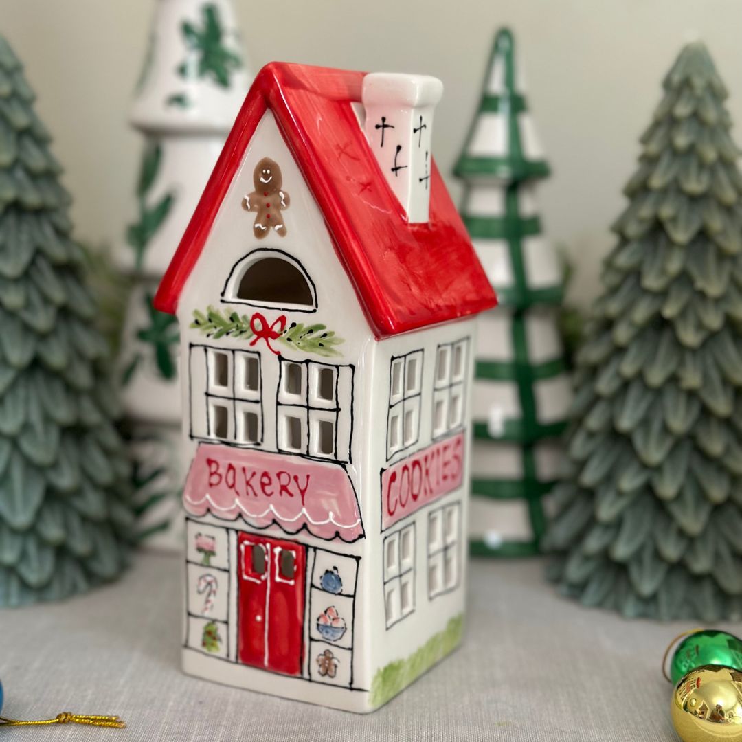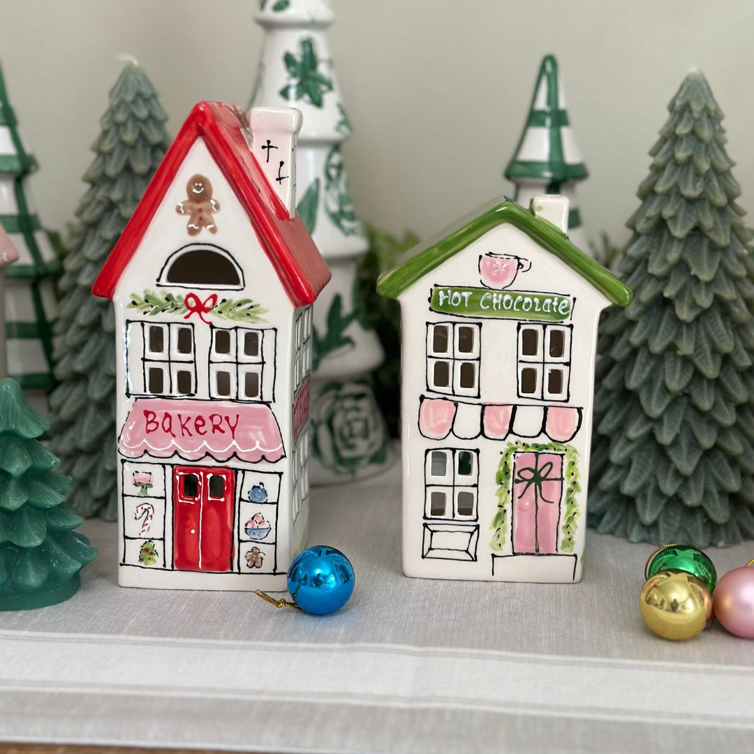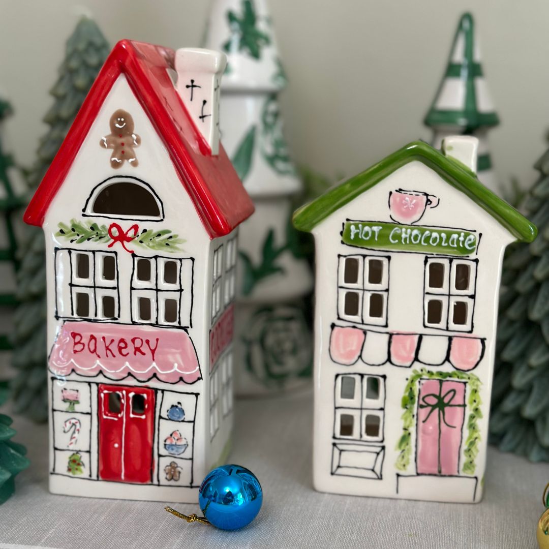 This gingerbread bakery holiday village home is our newest addition to our holiday village homes. Add it along with our pink hot chocolate house and other holiday village homes to make your own Christmas village! Hand painted in a classic style, this will be a keepsake for many years to come. Drop in a tea light and watch it glow from the inside.
