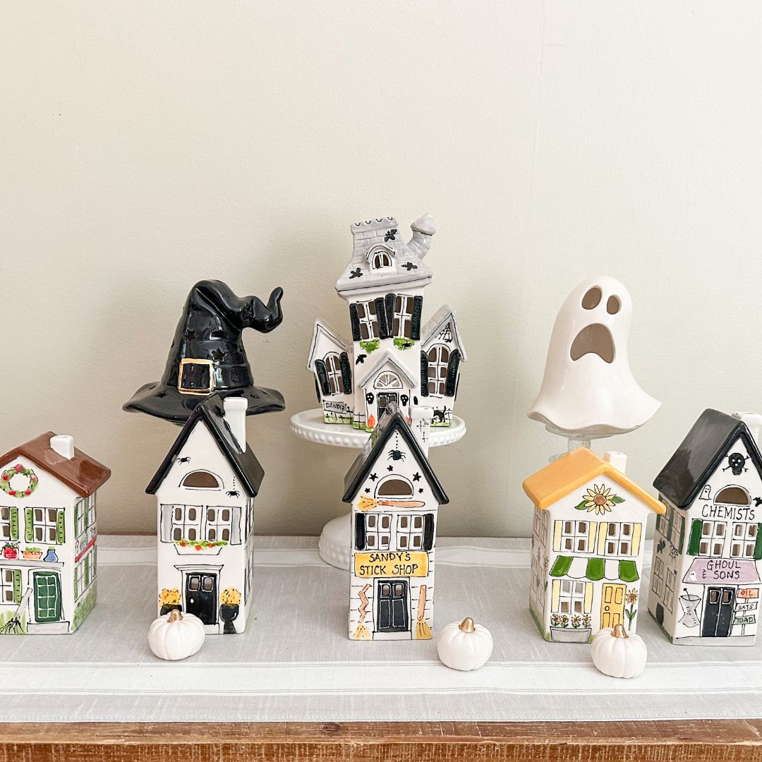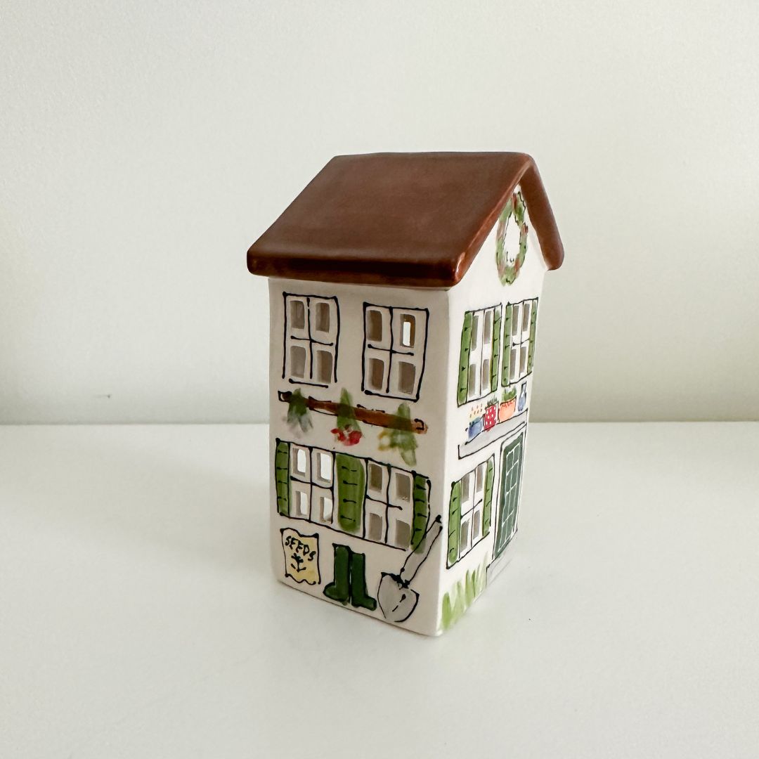 New for 2023! This Fall garden party themed village lantern features a brown roof and is perfect for the garden lover! It makes a perfect addition to your fall decor. Mix and match this with our other holiday home lanterns and create your own holiday village!