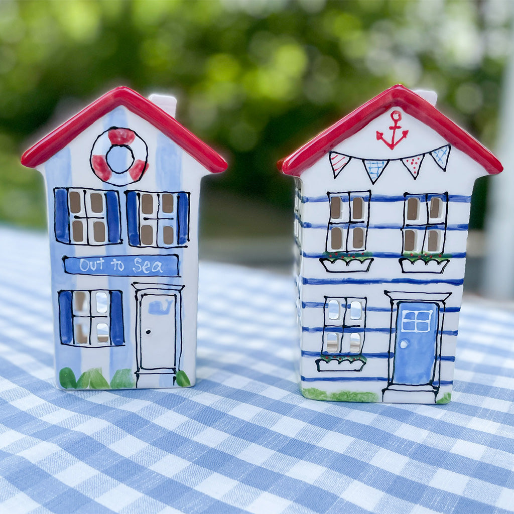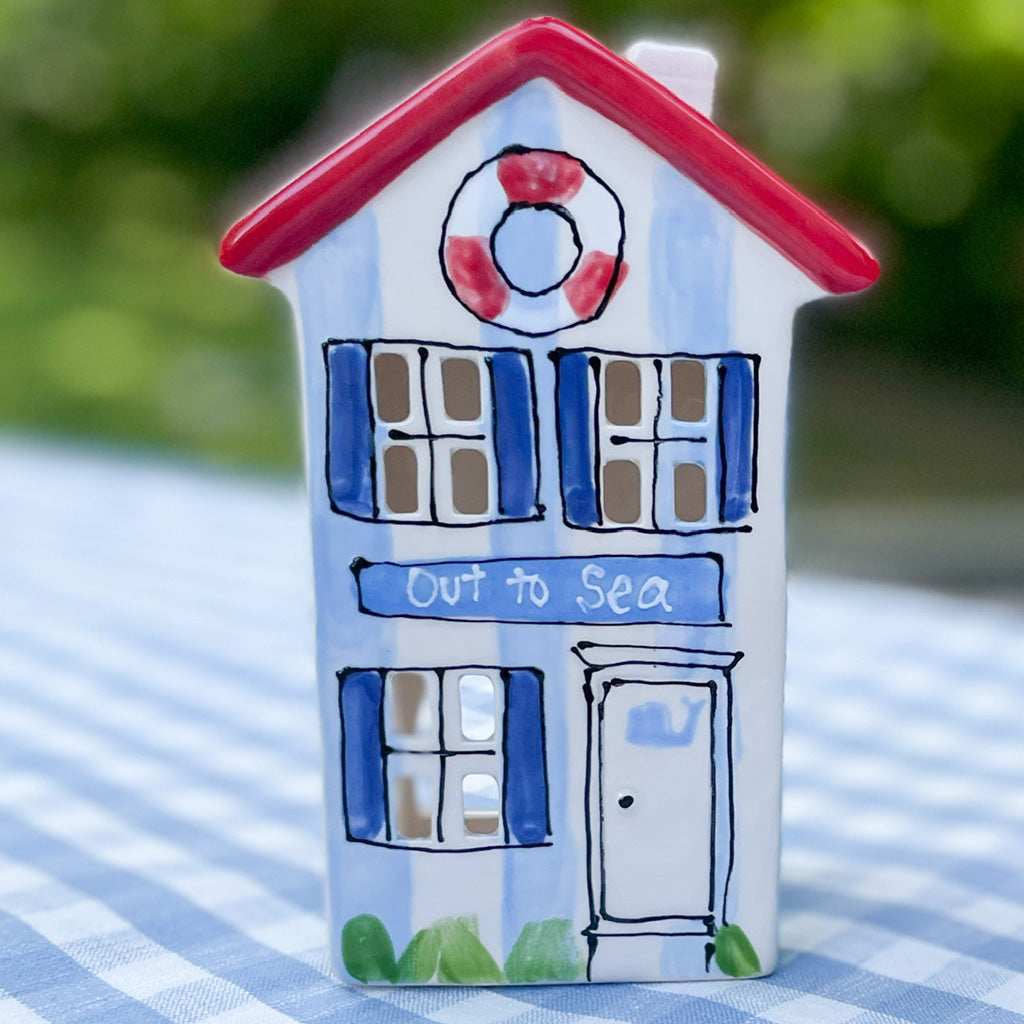 This Out To Sea home lantern features blue vertical stripes and a red and white lifesaver and makes a perfect addition to your summer decor. Mix and match this with our other holiday homes and create your own holiday village!