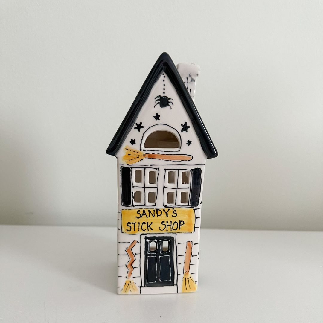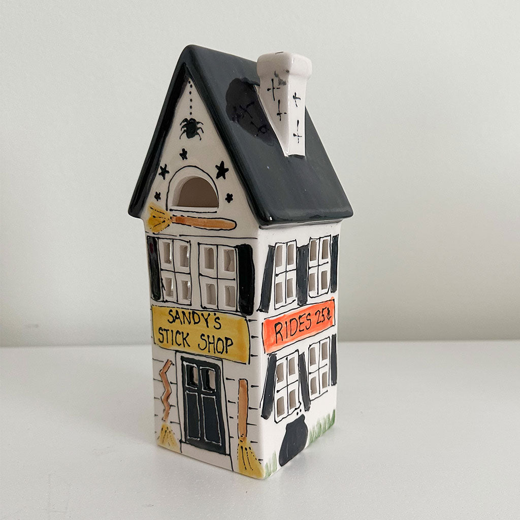 Sandy's Stick Shop village lantern features a black roof and is decorated as a witch's broom shop! It makes a perfect addition to your Halloween decor. Mix and match this with our other holiday home lanterns and create your own holiday village!