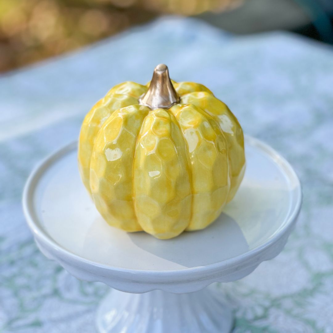 Perfect for Fall and Thanksgiving, our yellow hammered ceramic pumpkin will surely be one of your favorites.