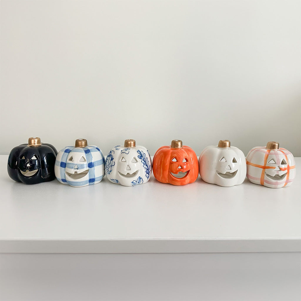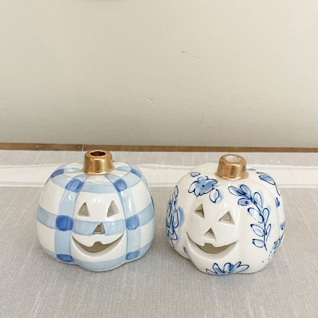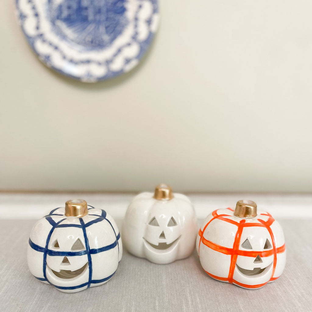 Take your Fall decorating to a new level with my mini pumpkin votives. Available in a variety of colors and patterns, you will want to have a set of these for a beautiful tablescape. Choose from solid pumpkins, gingham pumpkins or toile pumpkin patterns. Mix and match or pair the set. Accented with a gold cap these are a must have. I recommend using a battery-powered tealight.