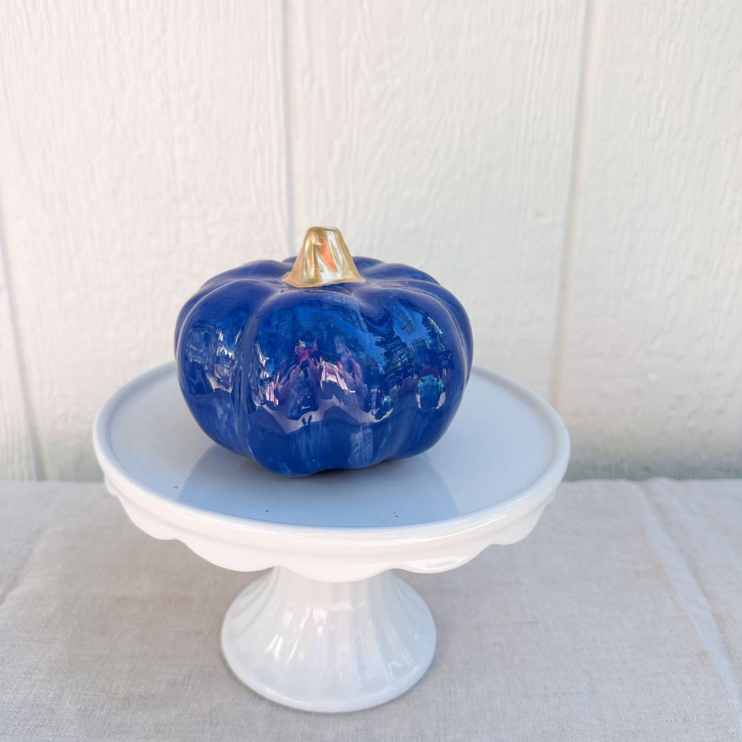 A medium pumpkin painted in a gorgeous blue color complete with a gold top!