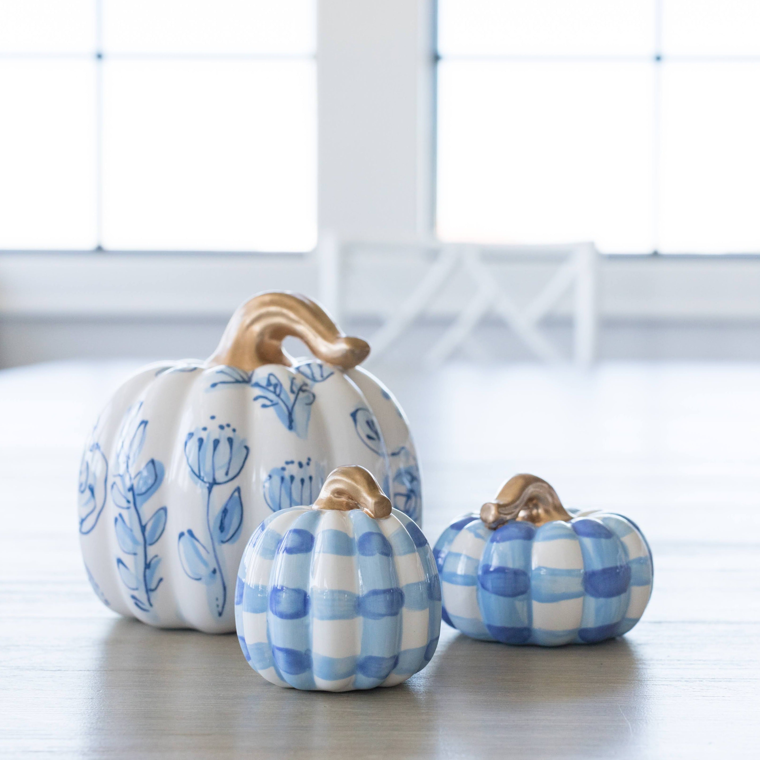 This set will include one chunky pumpkin in my modern floral blue and white pattern, one mini squatty pumpkin in the traditional blue gingham and one mini chunky pumpkin in the blue plaid Gingham.