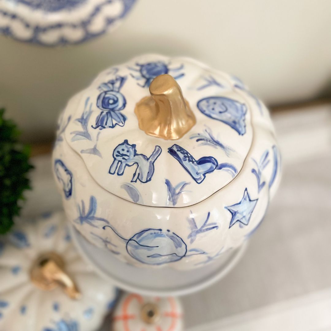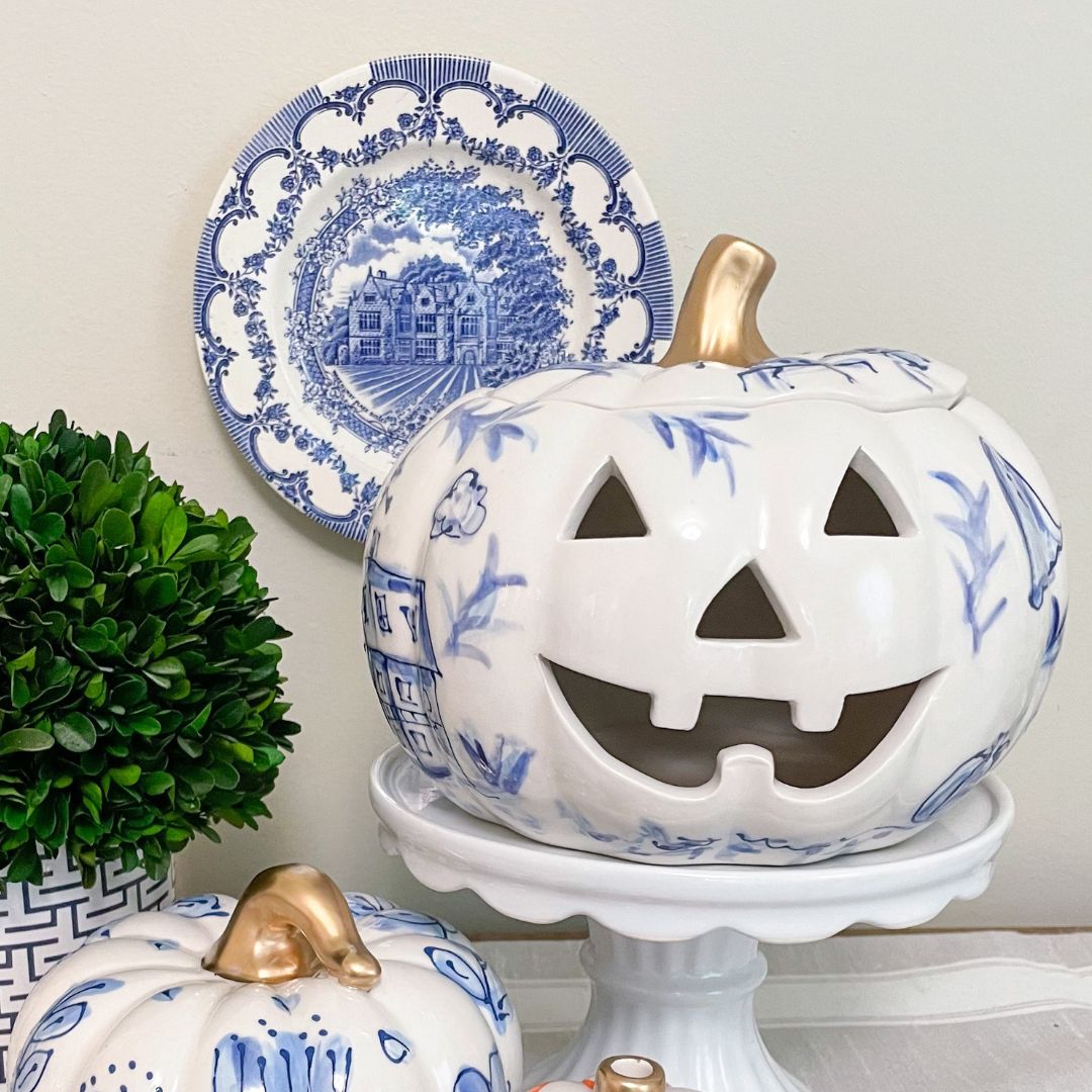 A large jack-o-lantern painted in a beautiful blue and white halloween toile pattern.