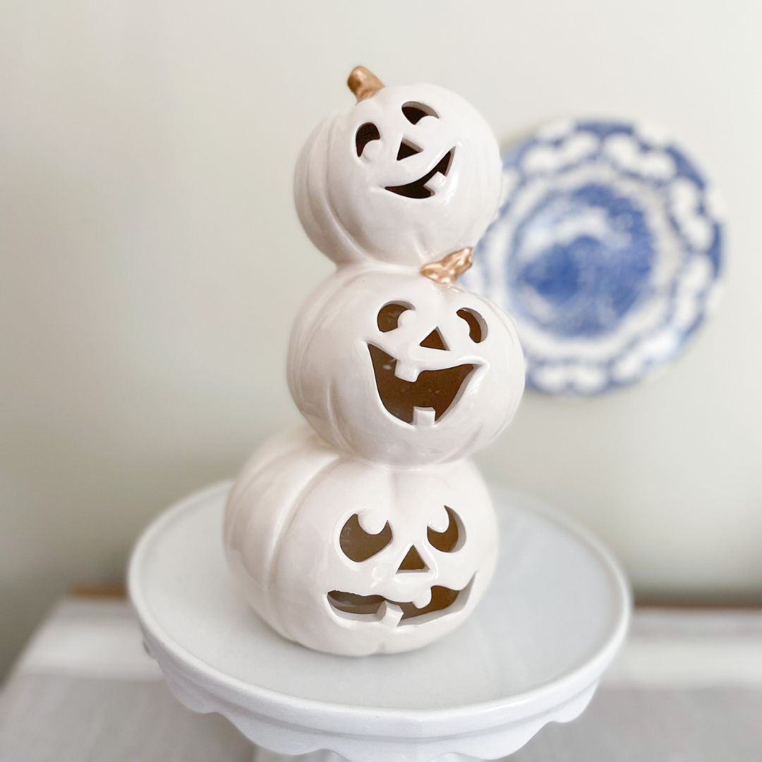 A stacked pumpkin lantern painted in white!