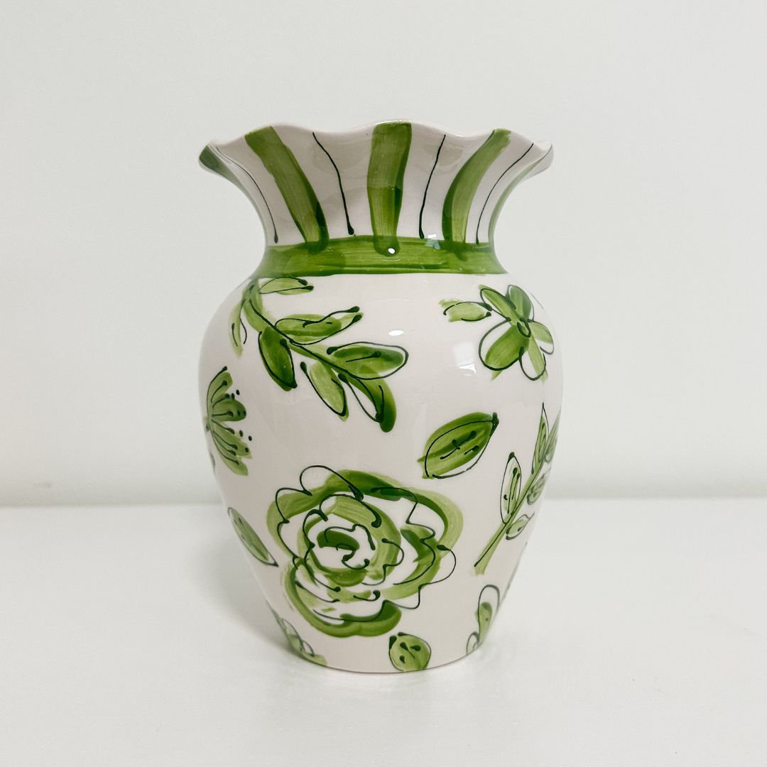 Hand painted, green and white, floral ceramic vase with a ruffled ridge. This one of a kind vase is sure to be a show stopper whenever you decide to display it. Green and white adorn this vase in both a floral and stripe pattern.
