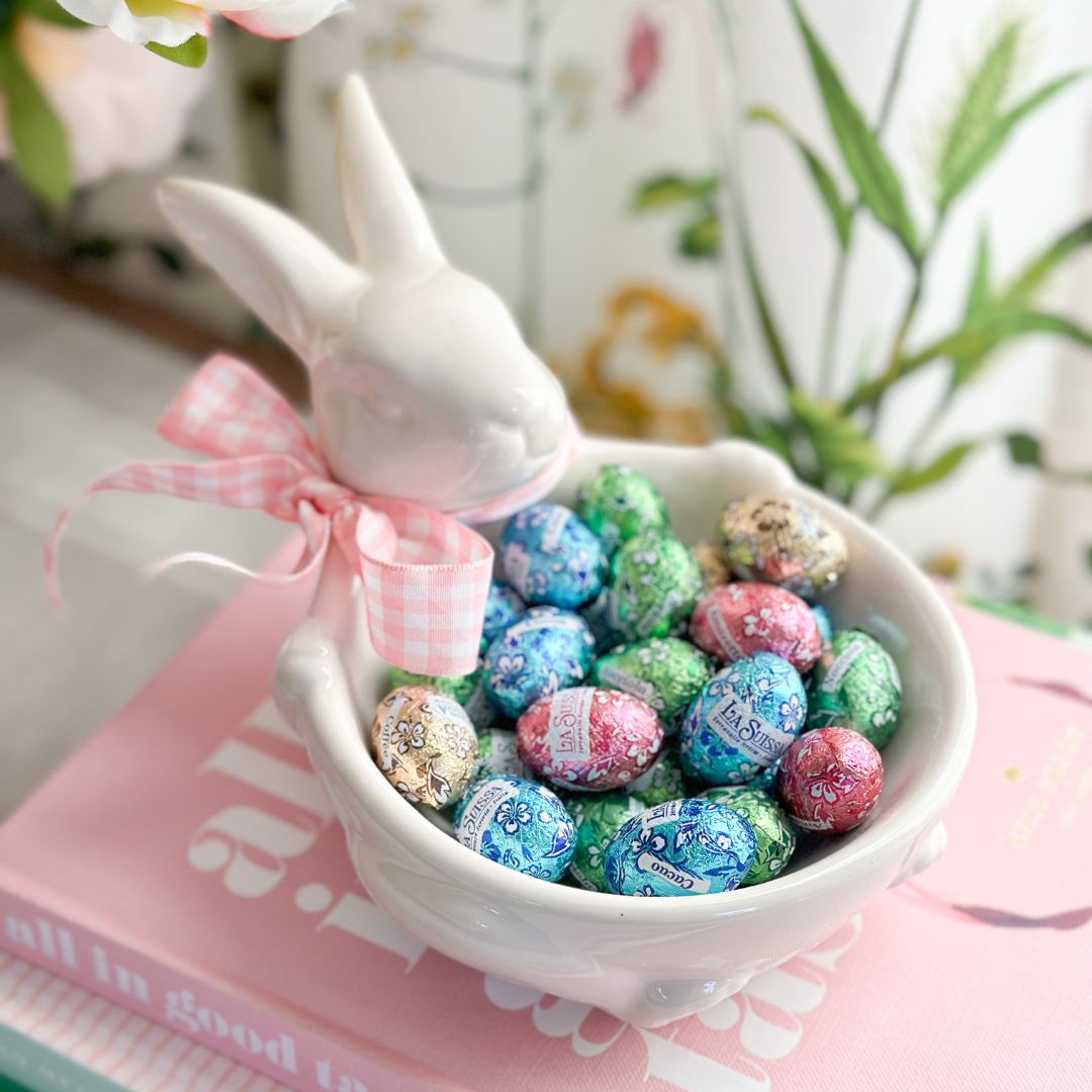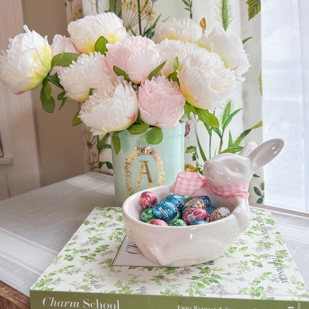 Your Easter candy has never looked so cute! My hand painted ceramic bunny bowl will be the perfect accent this spring. Dress him up with a ribbon, fill him with candy, or display a boxwood bowl in him. The options are endless with this versatile piece.