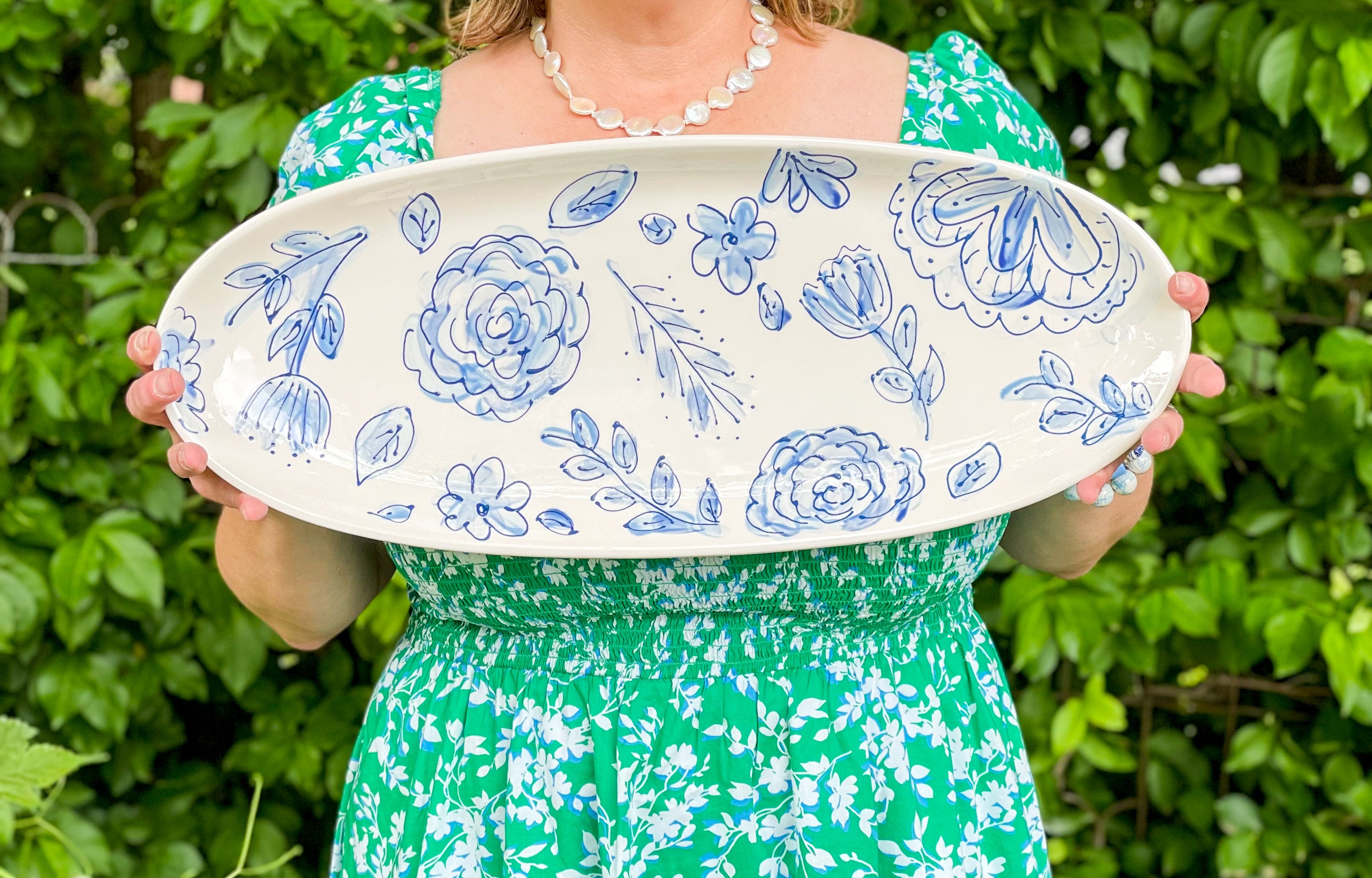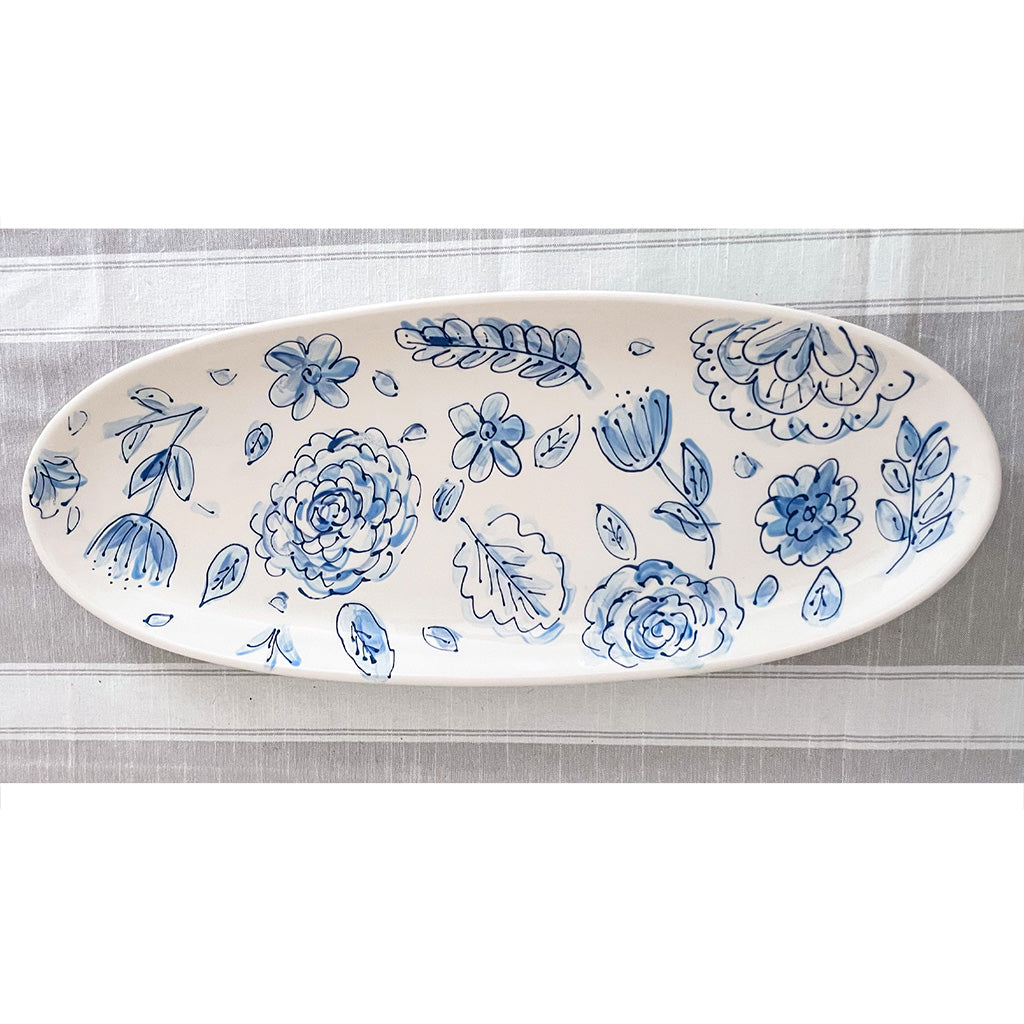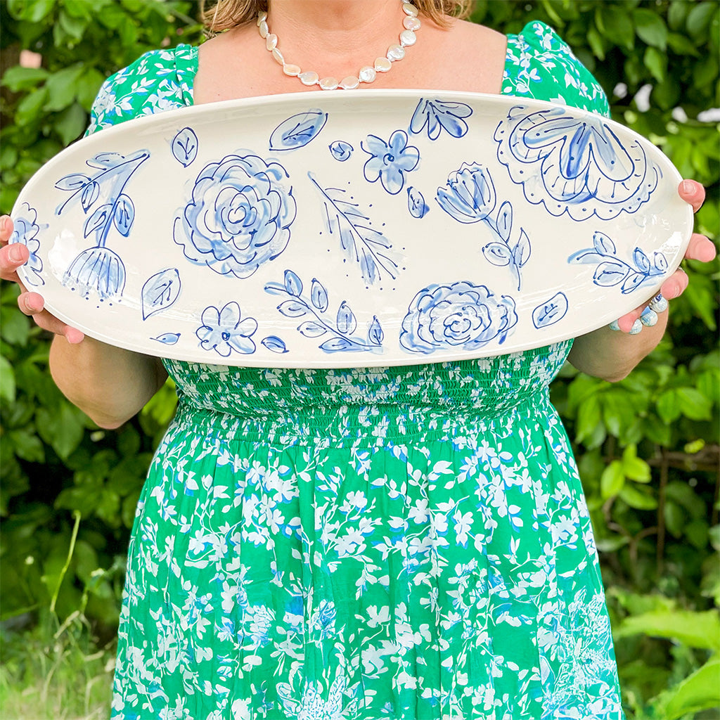 Measuring 21" x 8", this large oval platter is perfect for serving a crowd! Hand painted to order in my signature blue and white floral pattern, this platter pairs well with everything from your Grandmother's China to that piece you picked up at TJ Maxx. Add some of our scalloped bowls to make a great charcuterie board!