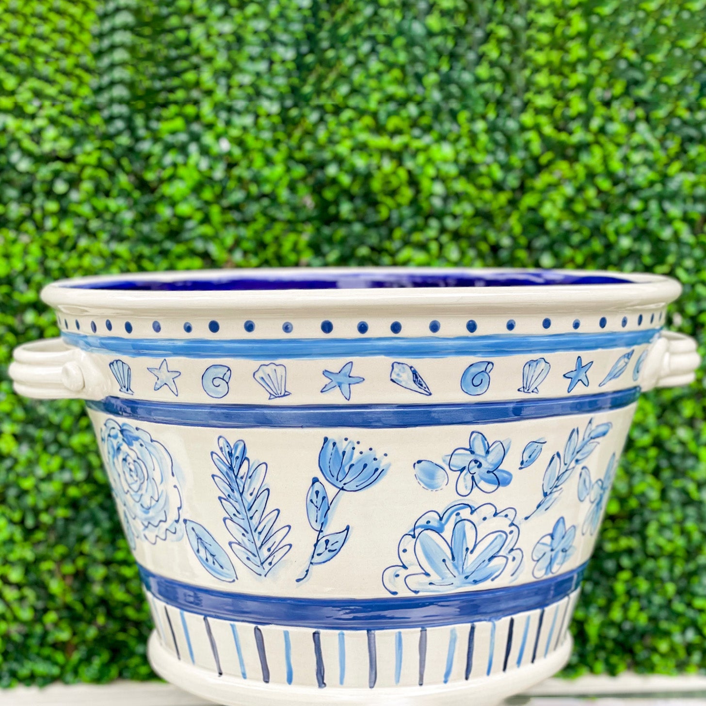 This beautiful beverage tub hand painted in a blue and white pattern and with a row of seashells is perfect for all of your entertaining needs!