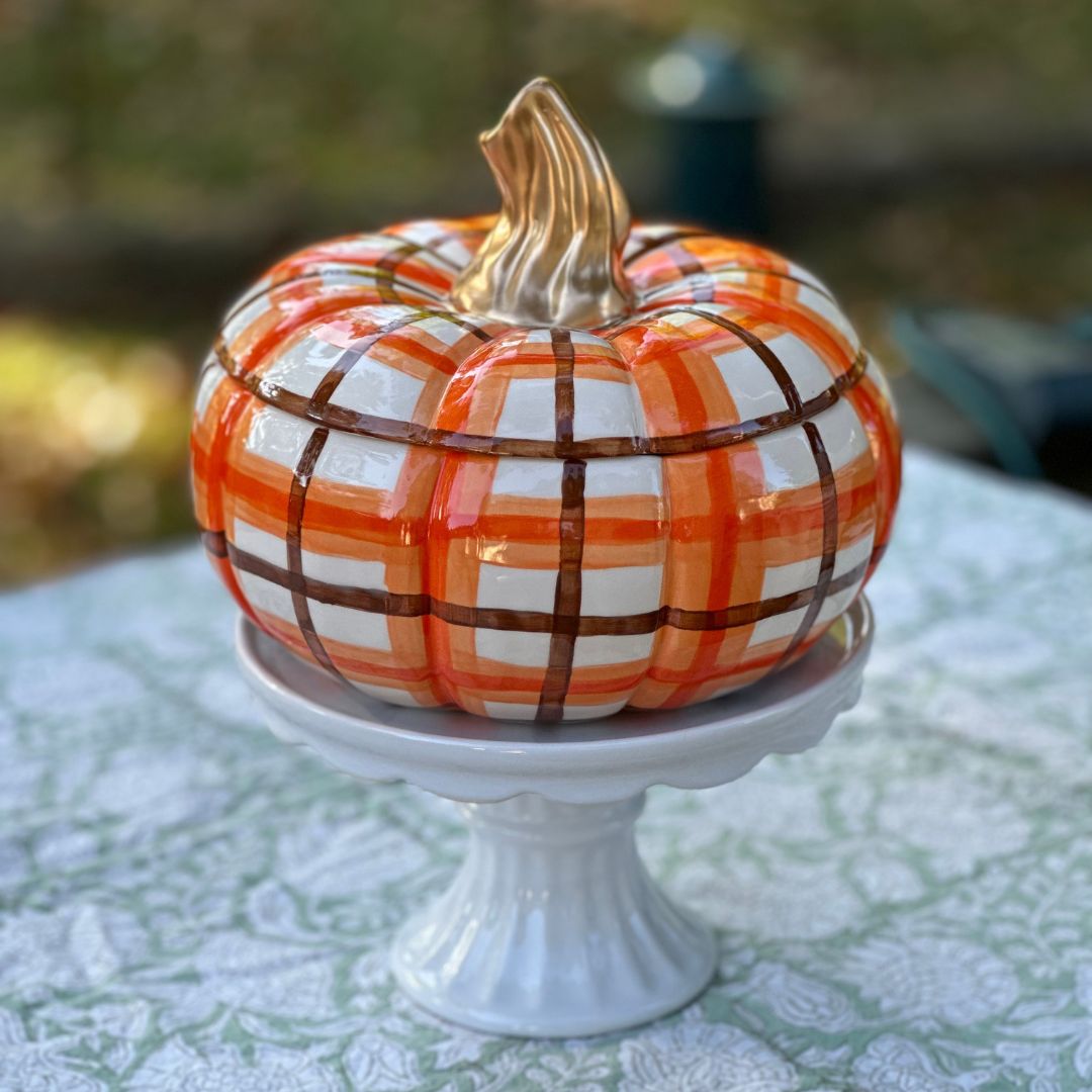This brown and orange plaid pumpkin tureen with a gold stem is a perfect addition for all of your fall and Thanksgiving decorating needs.