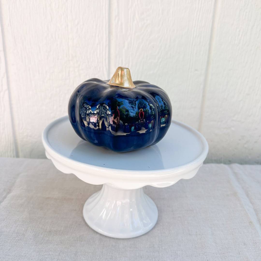 A medium pumpkin painted in a midnight blue color complete with a gold top!