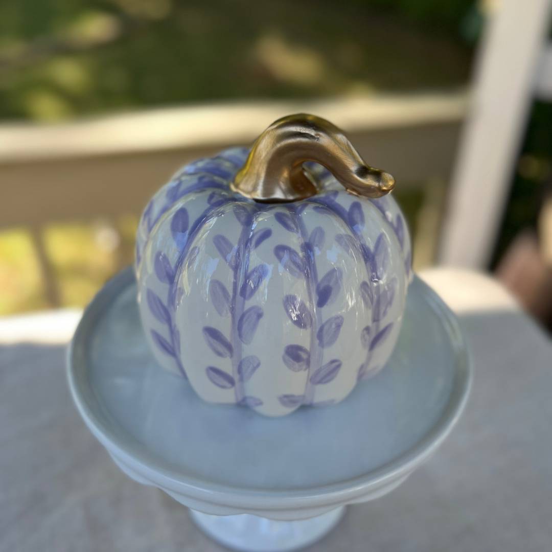 Perfect for Fall and Thanksgiving, this ceramic pumpkin painted in a purple hannah vine pattern, complete with a gold top, will surely be one of your favorites.