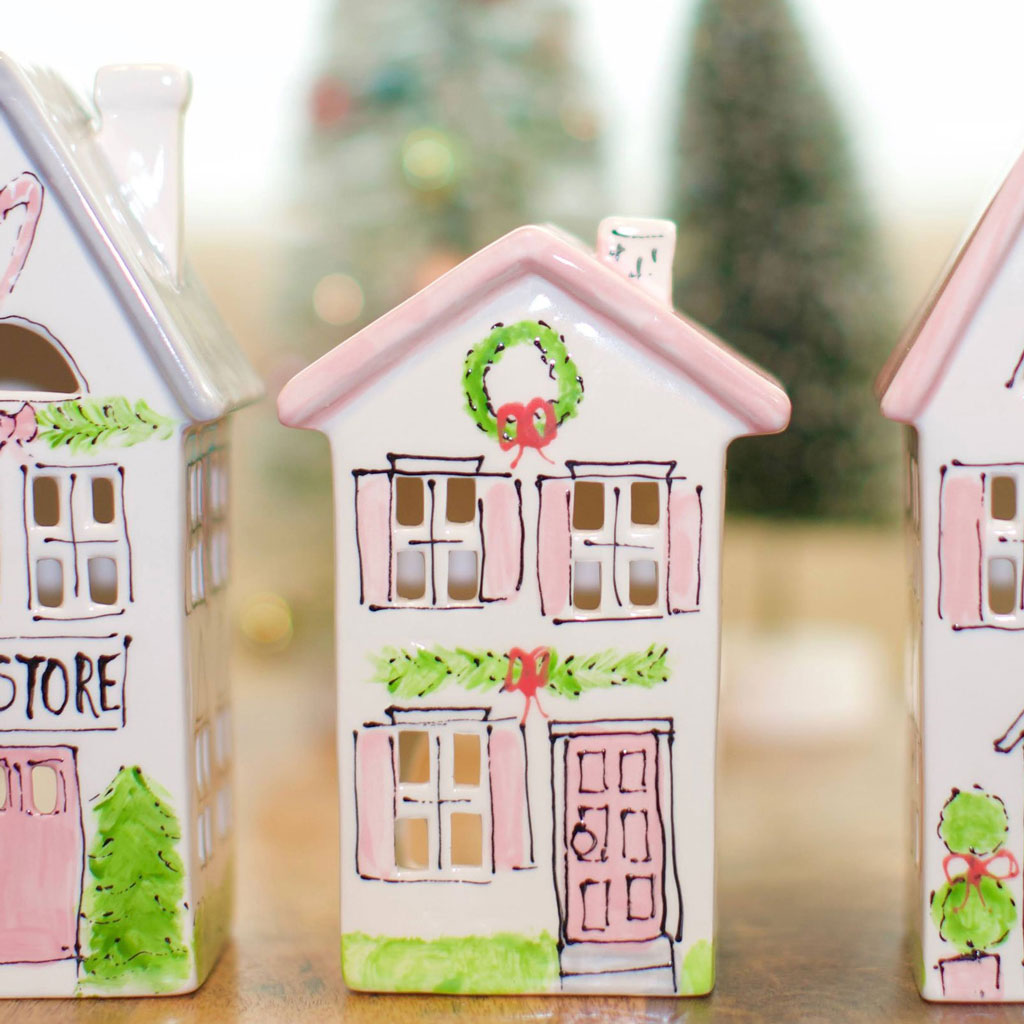 A classic pink Village house lantern hand painted with a green wreath and swag in a classic style that will be keepsakes for many years to come. Drop in a tea light and watch it glow from the inside.