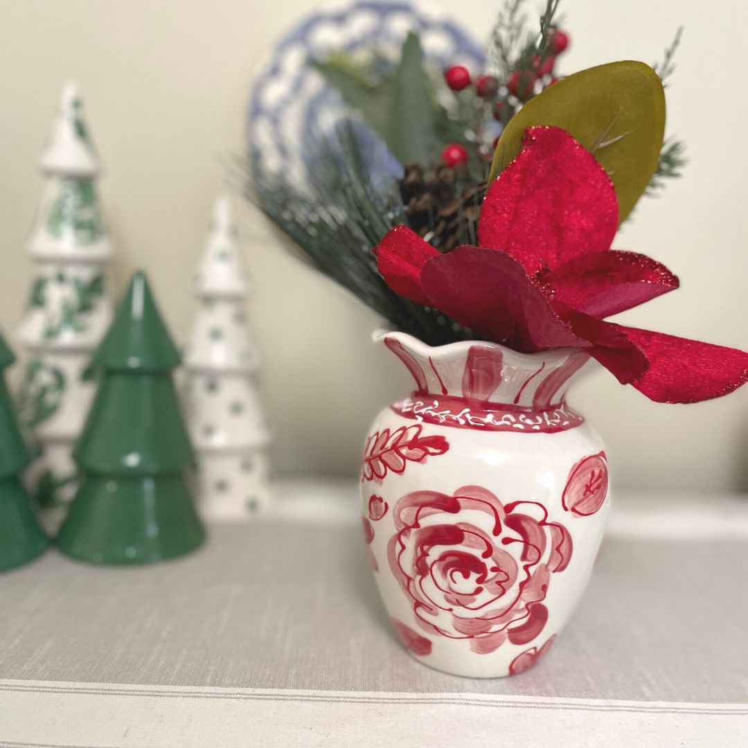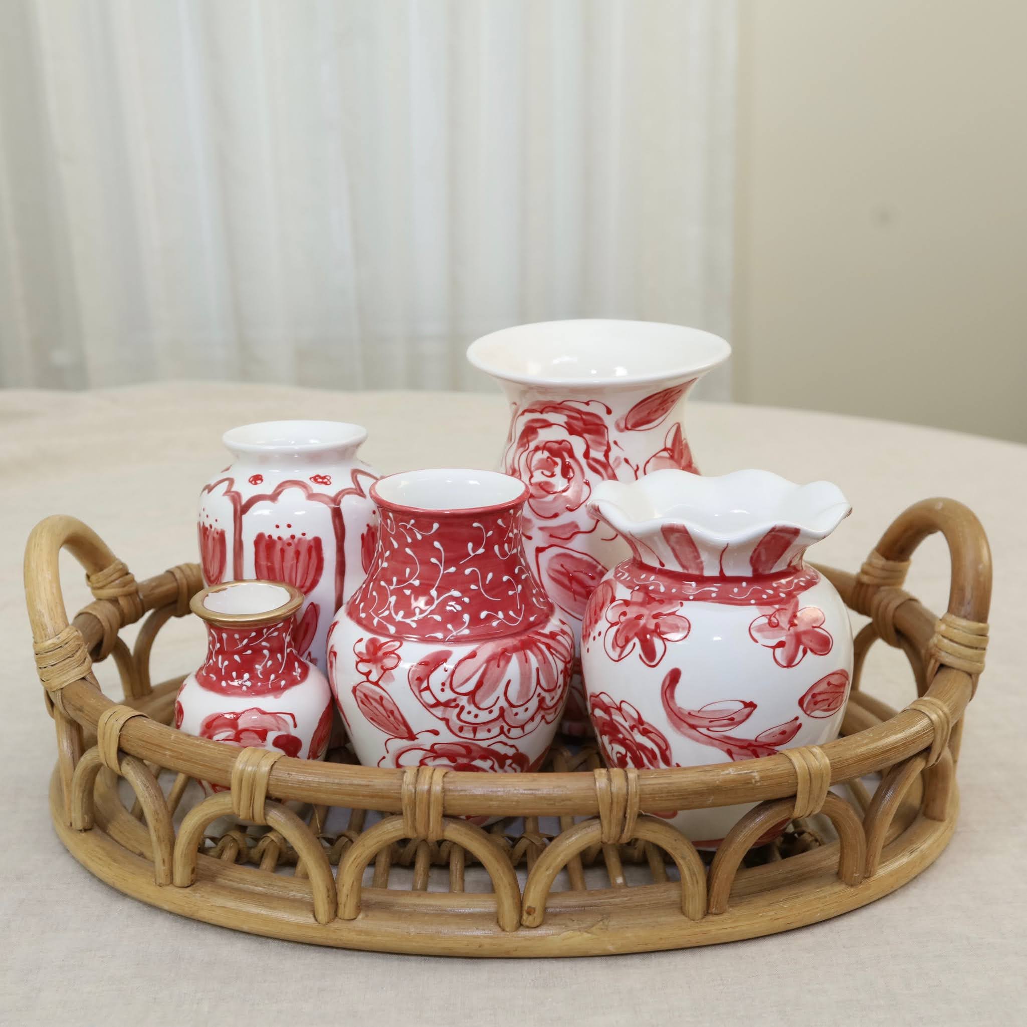 Hand painted, red and white, floral ceramic vase with a ruffled ridge. This one of a kind vase is sure to be a show stopper whenever you decide to display it.