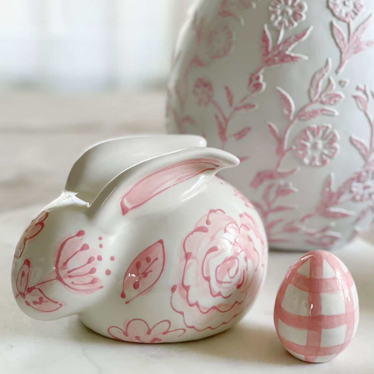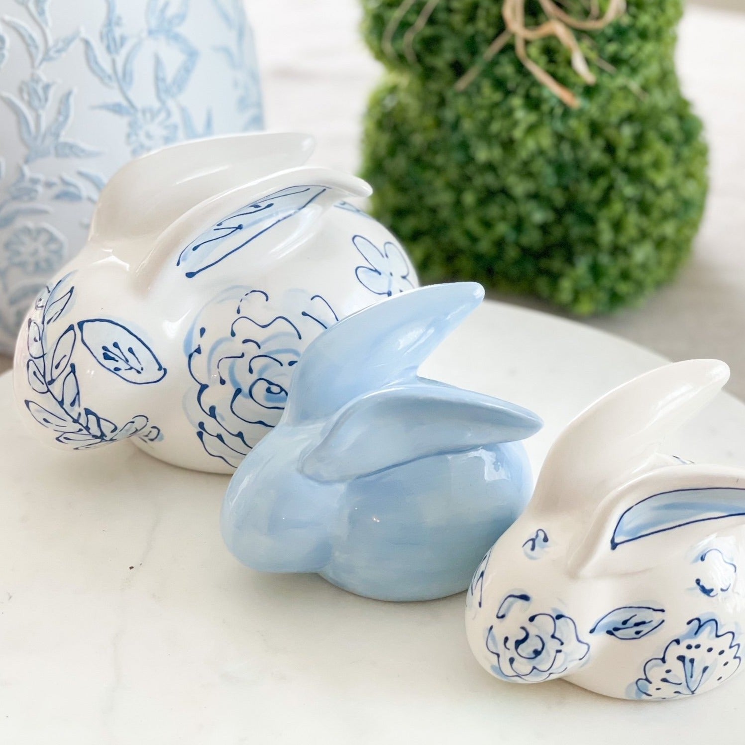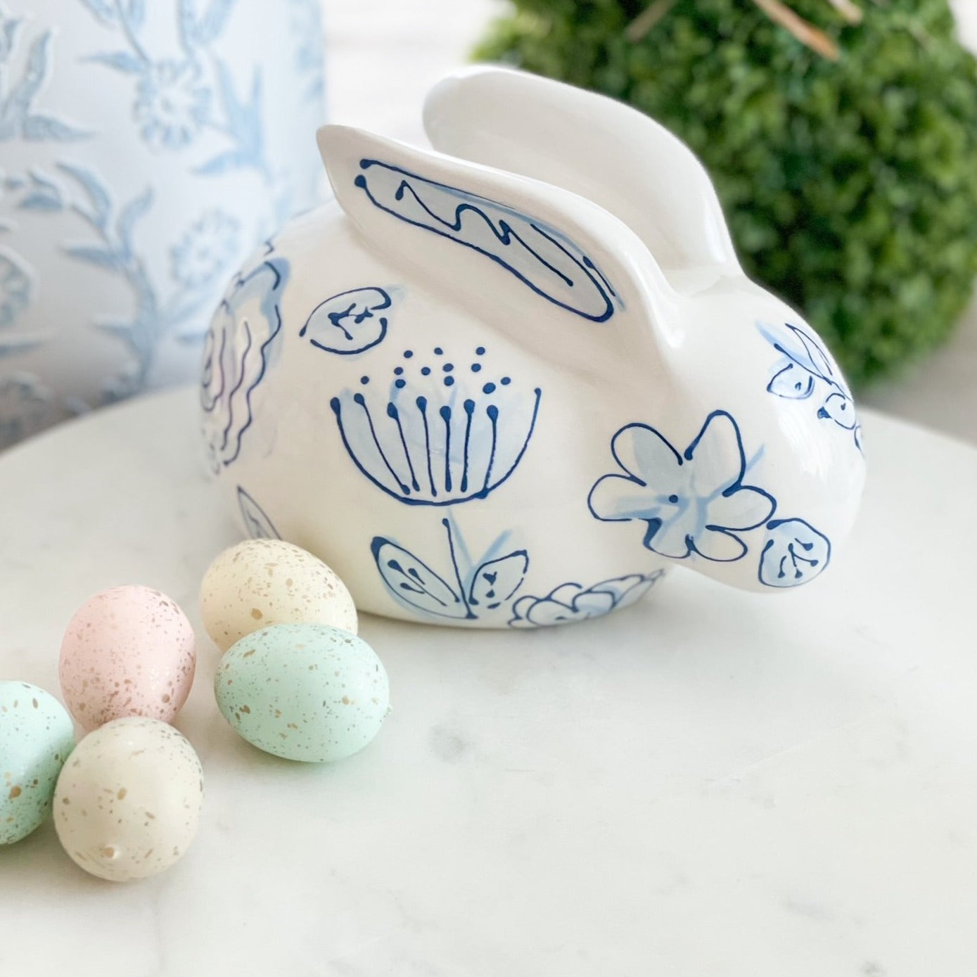 This sweet bunny is a little bit bigger than our 4" small hand painted ceramic bunny statue, and he is just as cute! Hand painted in a blue floral, pink floral or white, he will look darling on your table, mantel, bookcase or in your kids baskets this Easter.