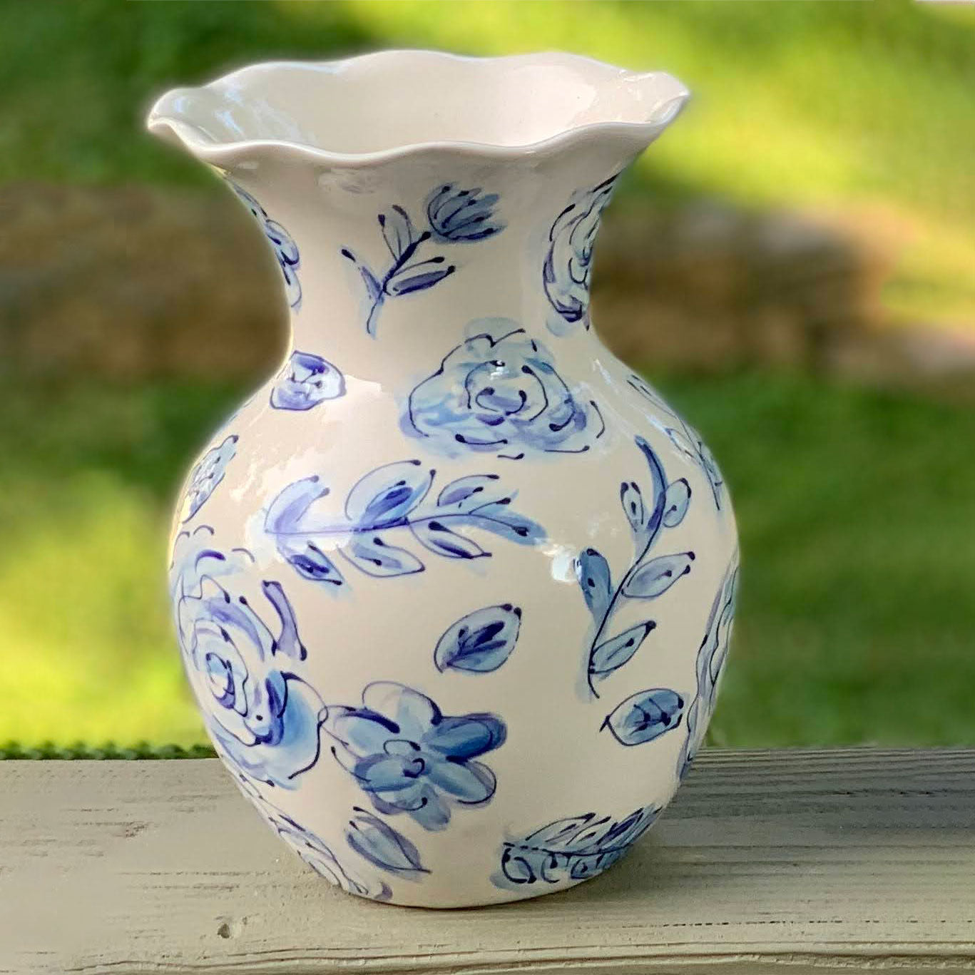 Hand painted, blue and white modern floral pattern ceramic vase. This one of a kind vase is sure to be a show stopper whenever you decide to display it.