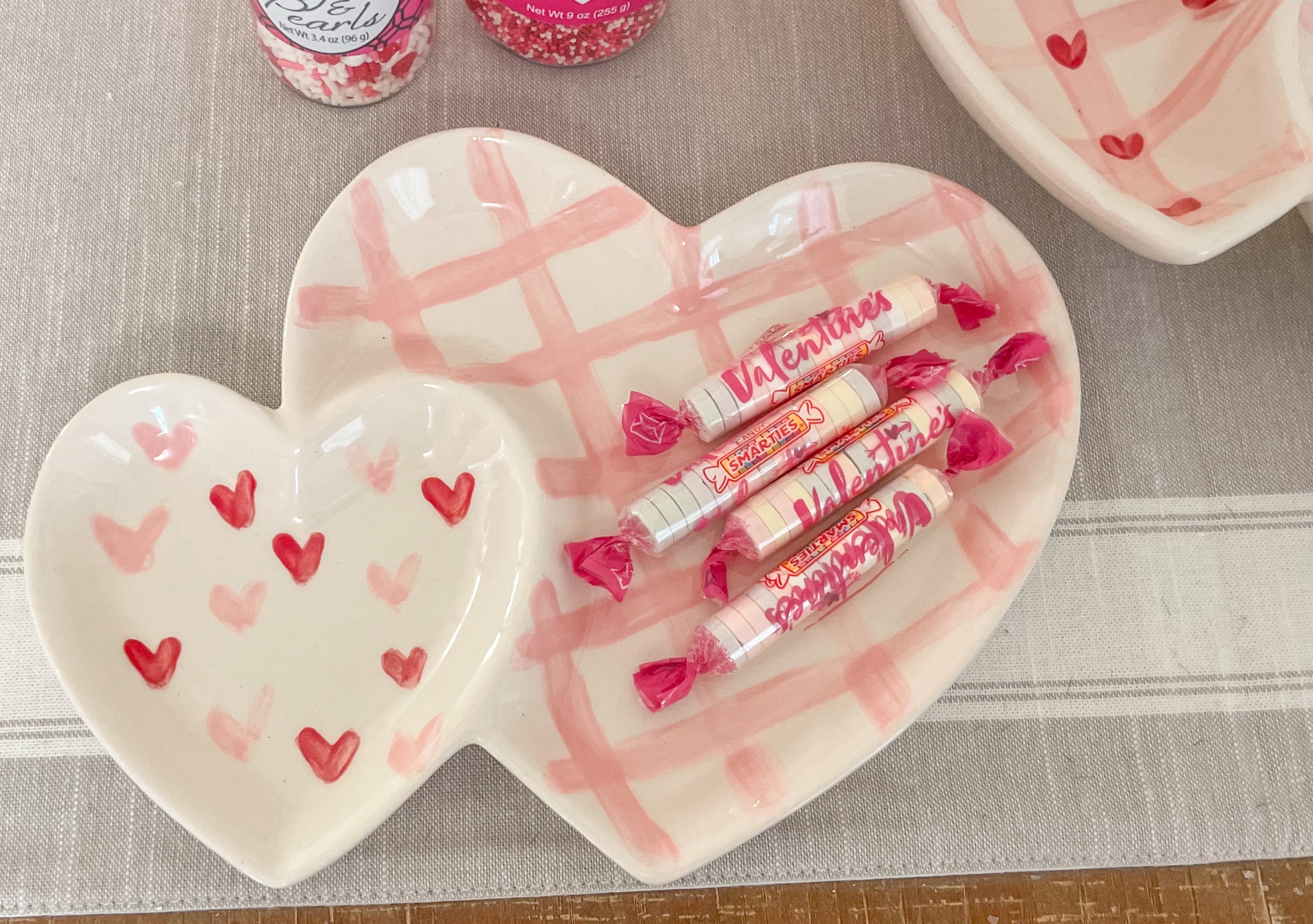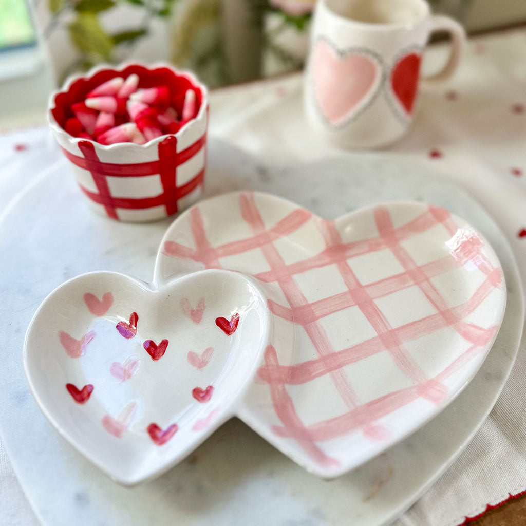 This double heart dish makes a great gift for Valentine's day or any special day! Hand painted with red and white hearts and a pink gingham pattern, this special dish can be used to hold your favorite chocolates year-round.