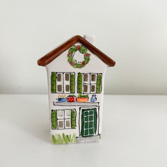 Brighten up your space with the Needlepoint Short House Village Lantern, a charming piece inspired by needlepoint lovers. Painted in cheerful blue and white, this whimsical village house brings a playful and cozy vibe to any room. Whether displayed on a shelf or as part of an arrangement with our our village homes, this lantern lights up your home with warmth and charm.