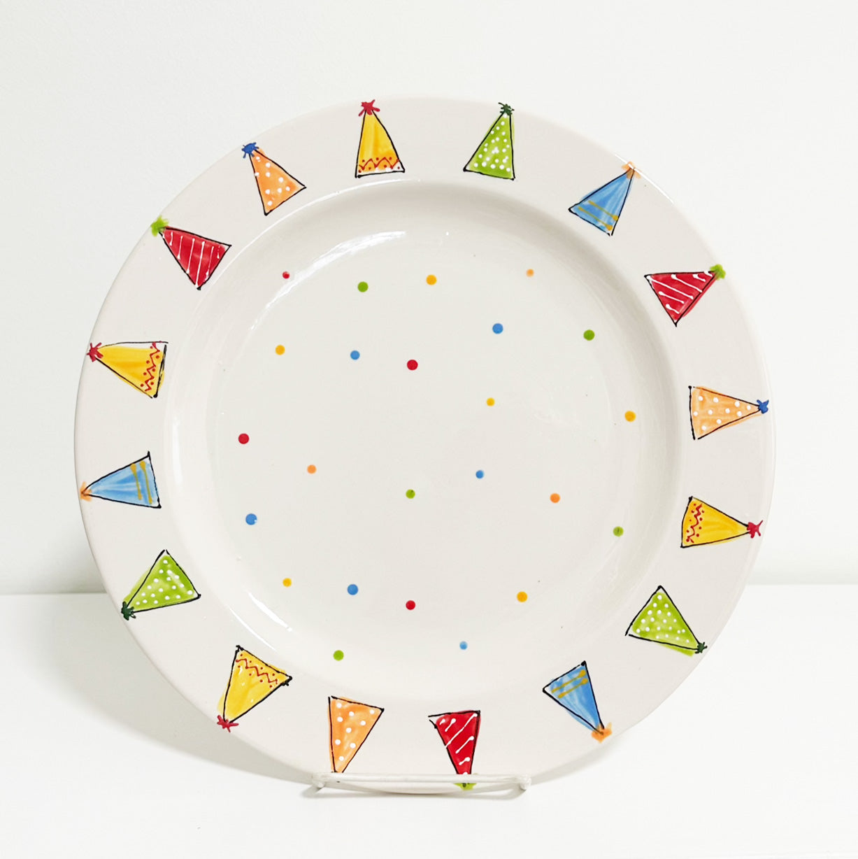 Celebrate your child's first birthday with this beautiful hand-painted plate! Painted with colorful birthday party hats and with either polka dots or a candle in the center, this plate is sure to be a keepsake!